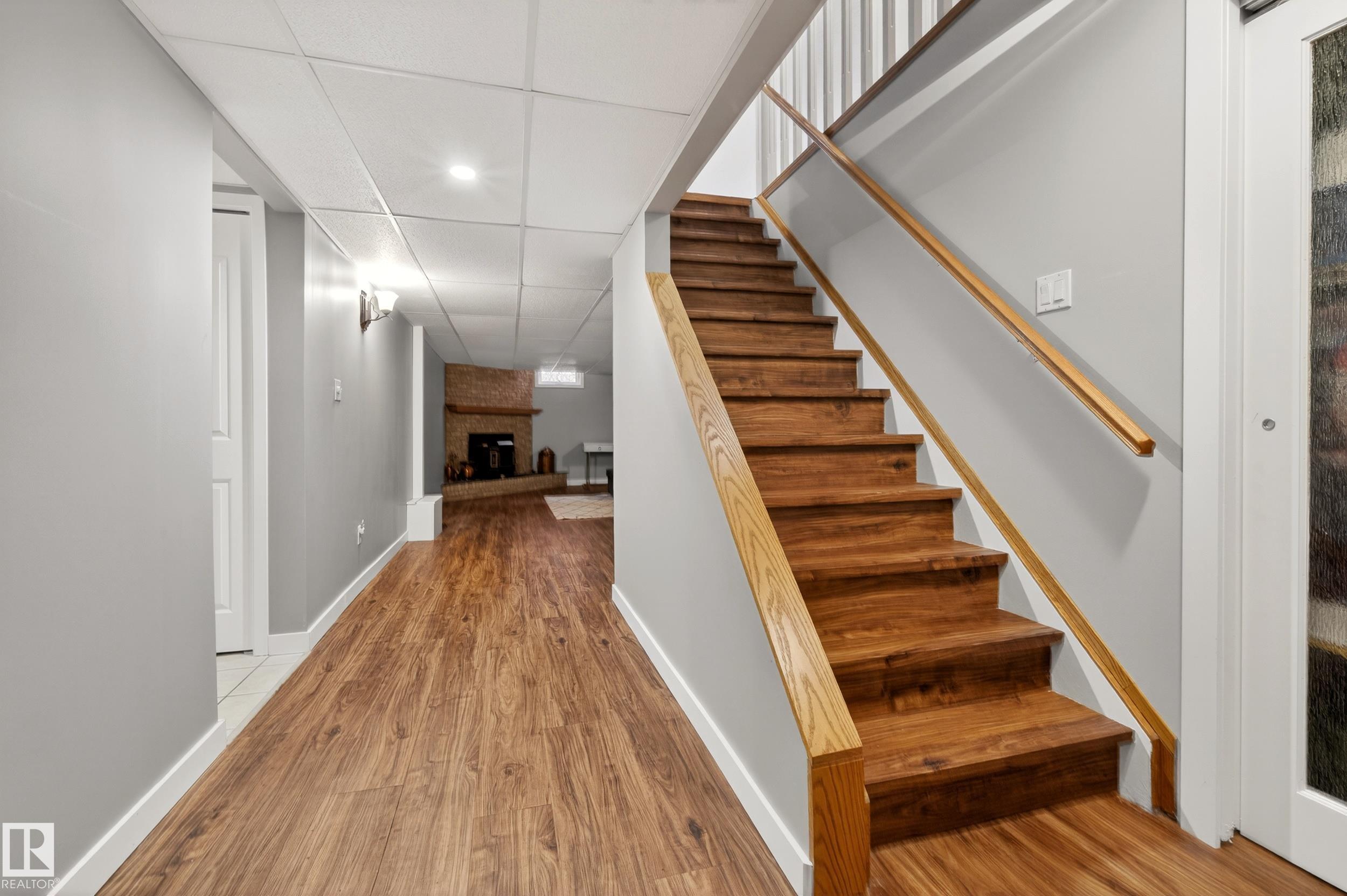 Welcome to this beautifully updated bungalow in the heart of Akinsdale, set on a massive 7,000+ sq ft lot with mature trees, where warm wood tones, natural light, and thoughtful upgrades come together effortlessly. This well-appointed 5 bedroom home offers a bright open-concept main floor anchored by an updated kitchen (2016) featuring quartz counters, tile backsplash, and central island with seating. Sunlit living and dining spaces flow seamlessly, highlighted by rich hardwood flooring and clean, modern finishes throughout. The main level includes a 4 pc bathroom, 3 generous bedrooms, and a spacious primary retreat overlooking the yard complete with double closets and a 3 pc ensuite. The fully finished basement adds a large rec room anchored by a warm brick-faced fireplace, 2 additional bedrooms, a 3 pc bathroom, and ample storage. Upgrades include hot water tank (2026) and roof (2013). Private yard with two-tiered patio. Double attached garage. Quiet location near schools, parks, and trails.