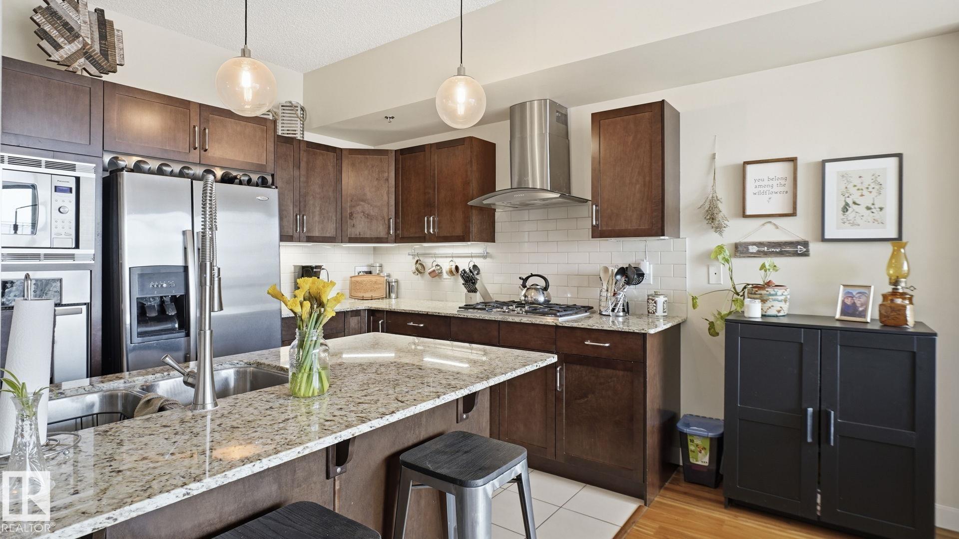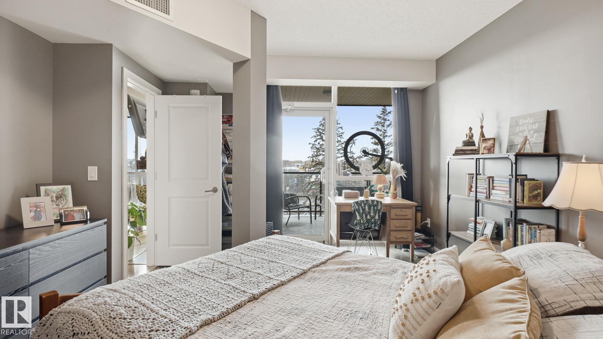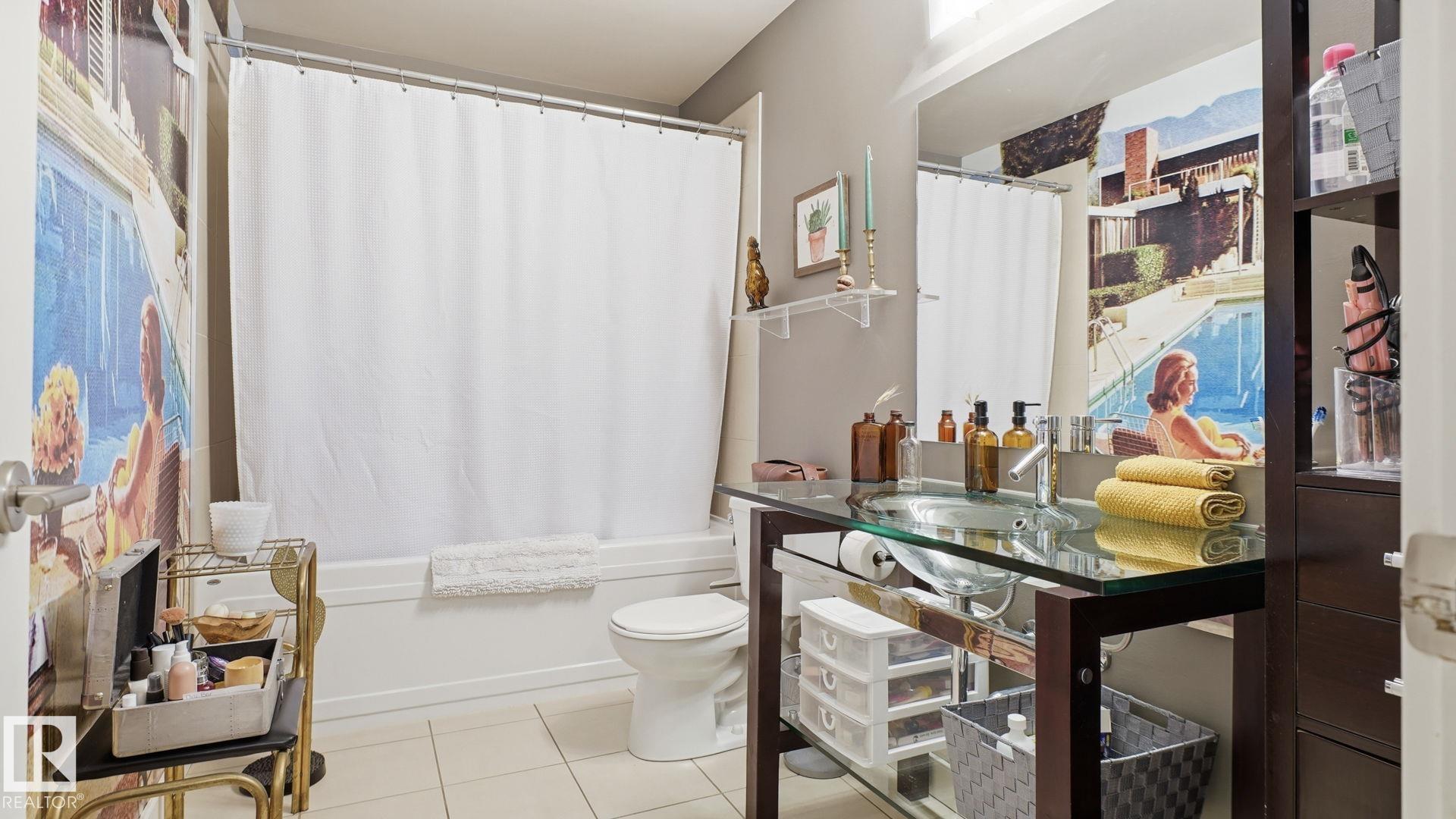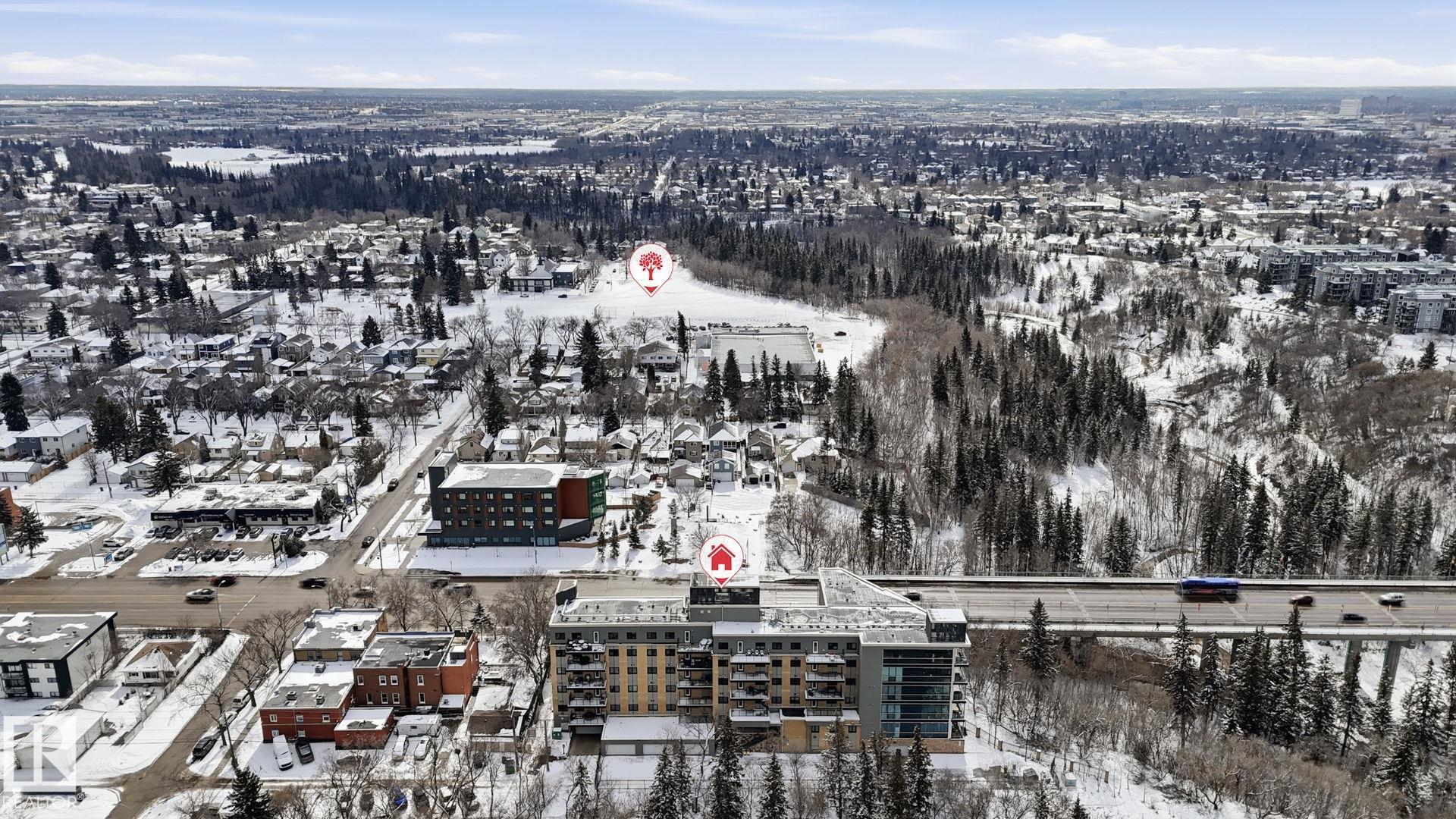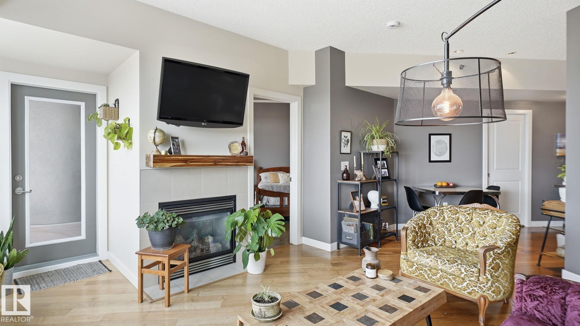 Inviting condo located in Trinity Pointe, a boutique concrete & steel building in Bonnie Doon, steps from Mill Creek Ravine. This bright unit features expansive windows, and a spacious open-concept living area anchored by a cozy gas fireplace. The well-appointed kitchen offers a gas range, built-in oven, dishwasher, and ample cabinetry—perfect for everyday living and entertaining. The spacious corner layout provides excellent natural light and direct access to a private balcony with treed views. The generous primary bedroom includes a walk-in closet and access to a full bath, while in-suite laundry adds everyday ease. Includes 1 underground parking stall and additional storage. Pet friendly building with great amenities featuring a fitness room and secure parkade. Walk to ravine trails, cafés, Whyte Ave, and the Valley Line LRT. Ideal for professionals, students, or investors seeking a low-maintenance lifestyle.