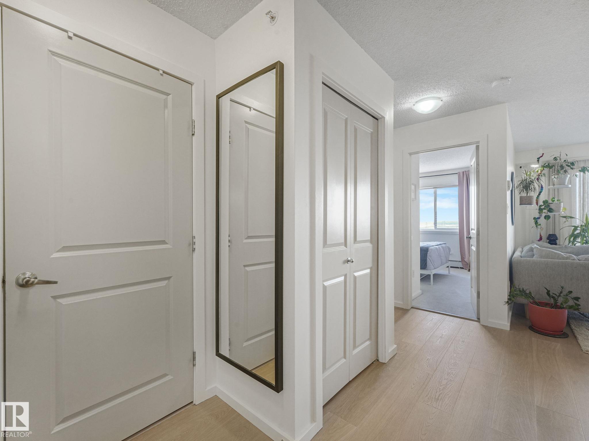 TOP FLOOR, bright, updated unit with unobstructed views of the river valley! 810 sq ft, 2 bedrooms / 2 full baths, plus 2 titled UNDERGROUND HEATED parking stalls and storage cage (located on the same floor as the suite). Open-concept layout with an island kitchen with stainless steel appliances, pantry, a new built-in coffee nook. Fresh white paint throughout, and new laminate flooring in kitchen/living room. Microwave/hoodfan, dishwasher, kitchen faucet are new. Unit has insuite laundry! Easy access to Victoria Trail, Yellowhead, and the Henday + ample visitor parking.