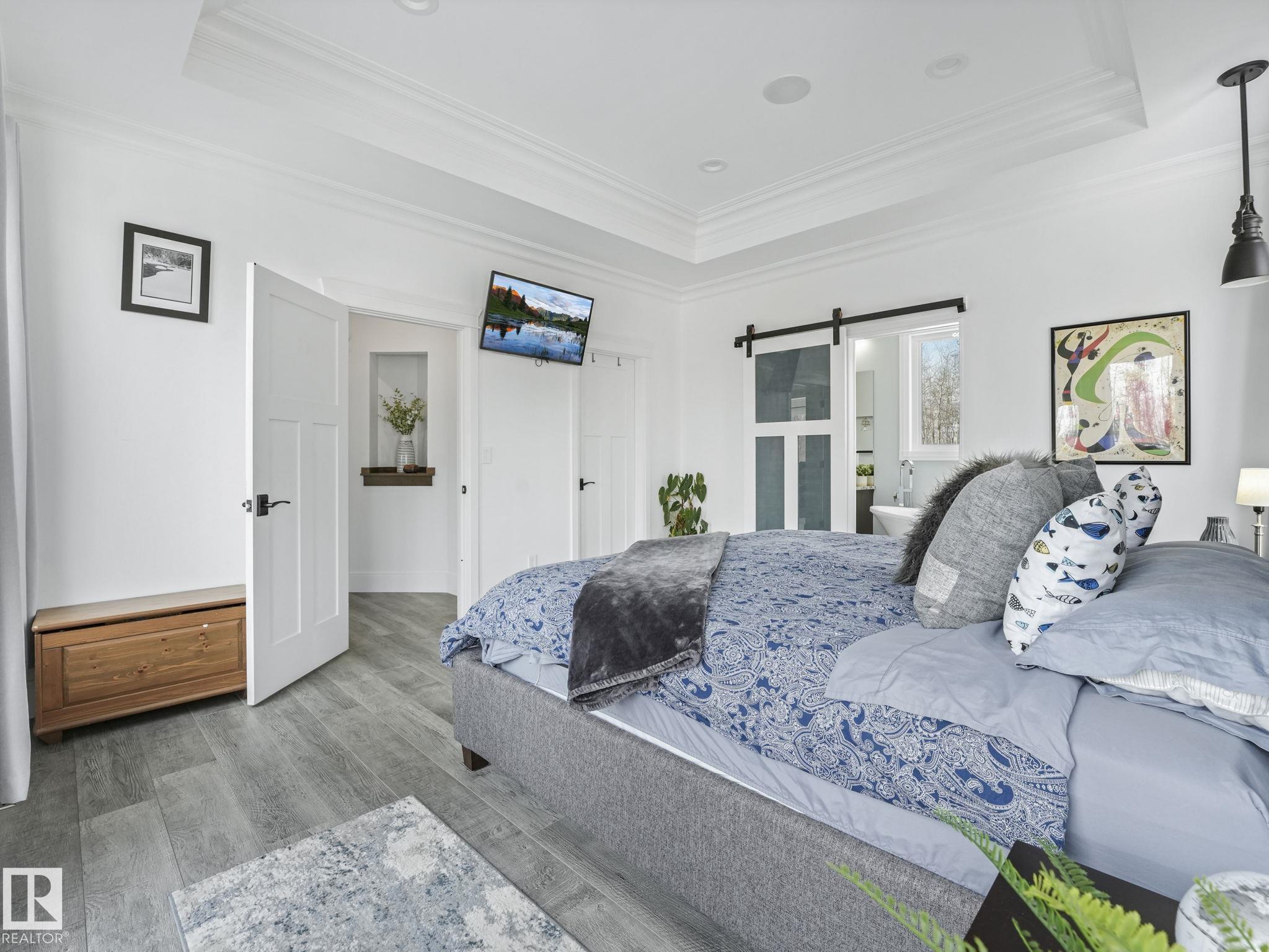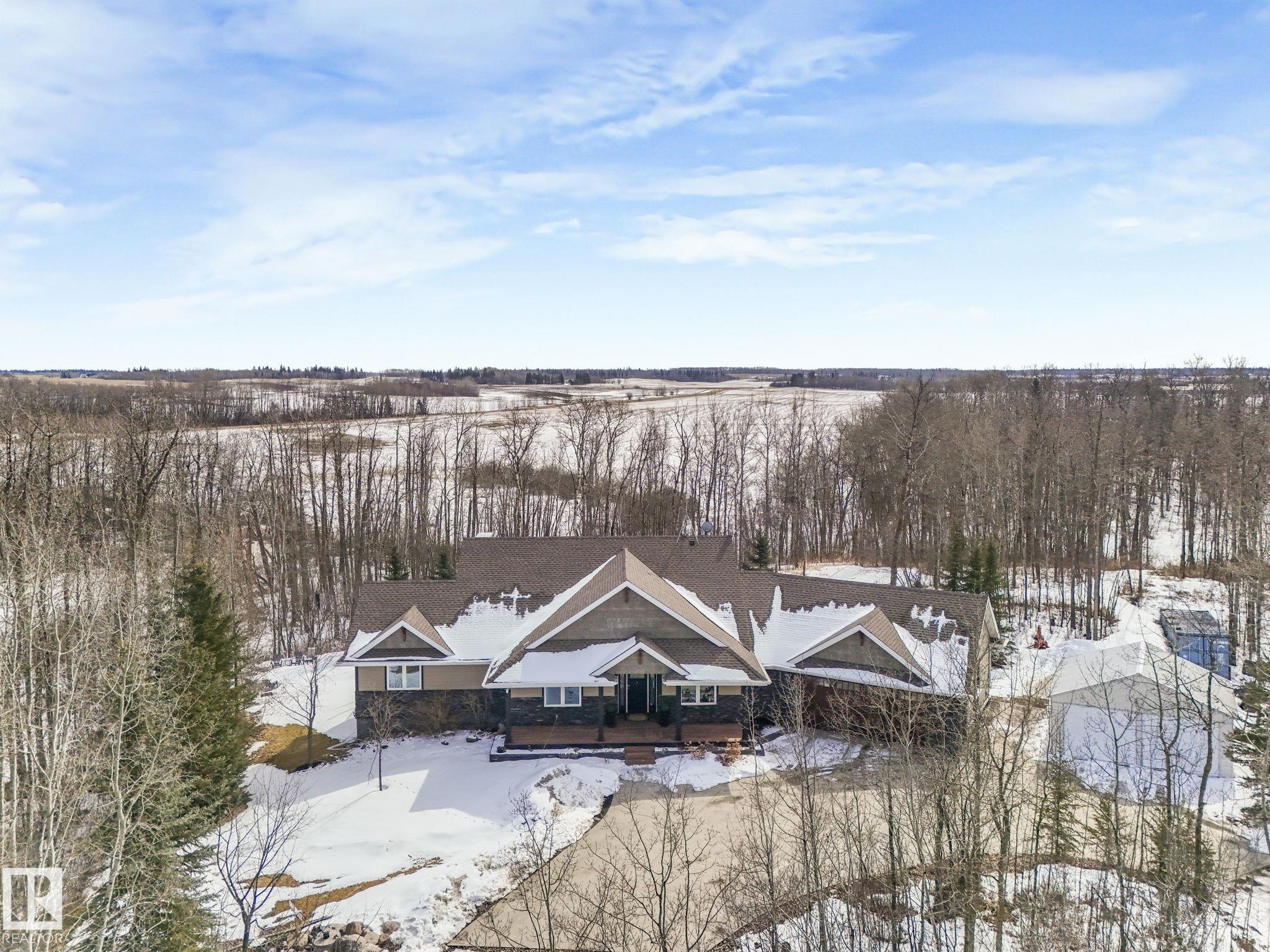 Stunning 5-bedroom home on 2.95 acres in one of Leduc County’s most sought-after country residential communities—just minutes to Beaumont, Leduc, and Nisku. Enjoy paved access, new flooring, and smart home features controlling lighting, sound, and temperature. The primary suite offers patio access to your private oasis. Chef-inspired kitchen with stainless steel tile, copper sink, dry bar, wine rack, custom cabinetry, granite countertops, crown mouldings, and coffered/vaulted ceilings, plus a butler’s pantry. Main floor features two bedrooms, each with its own ensuite. The walk-out basement includes 2 additional bedrooms, in-floor heating, wet bar, media room/3rd bedroom, full bath with walk-in shower, and ample storage. Upgrades include triple-pane windows and sliders, on-demand hot water, and ICF foundation. Oversized heated attached garage, double detached garage, 30-amp RV plug-in, electric gate, private driveway, and 18.2 KW solar system—offering luxury, comfort, and functionality.