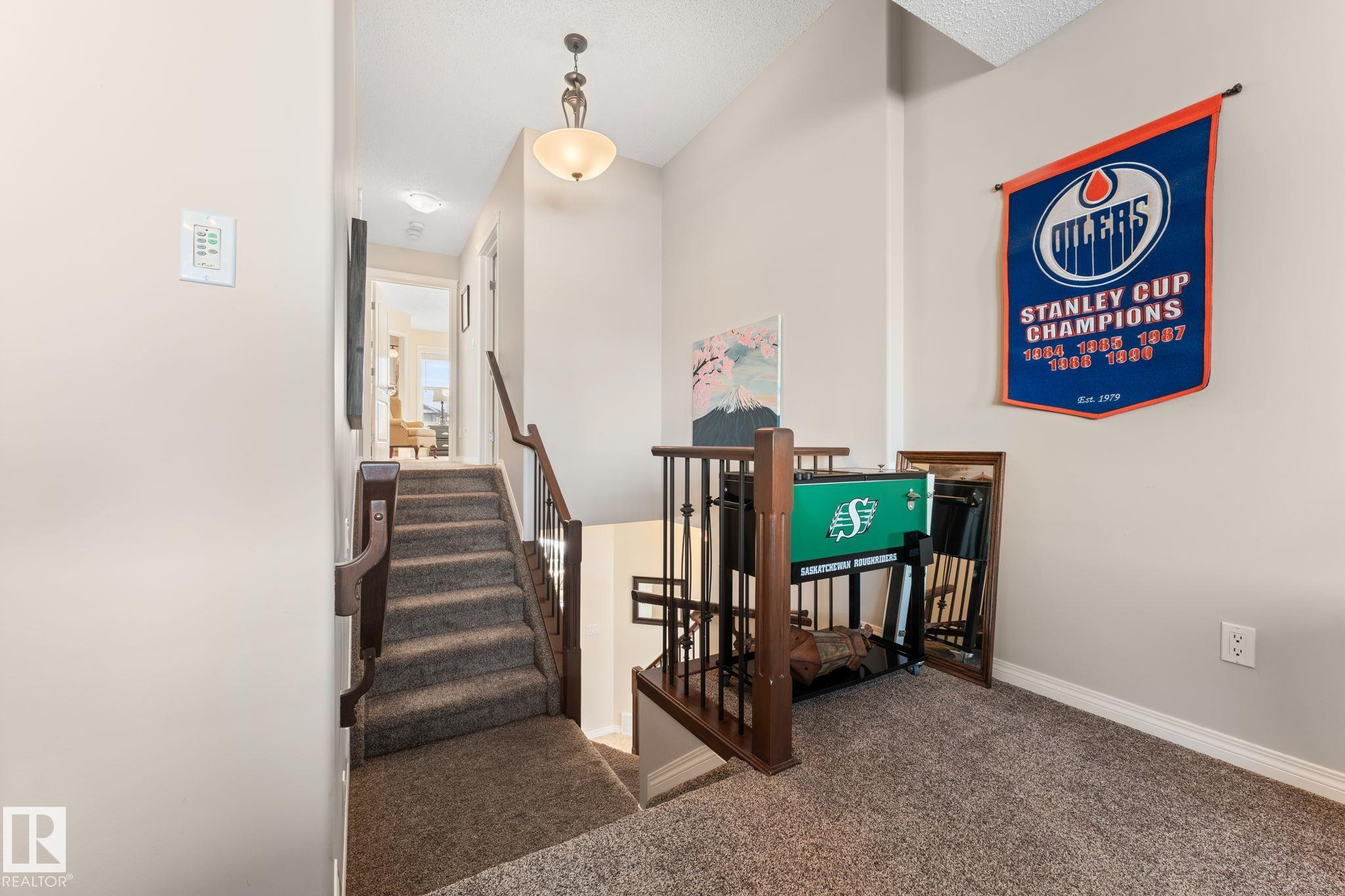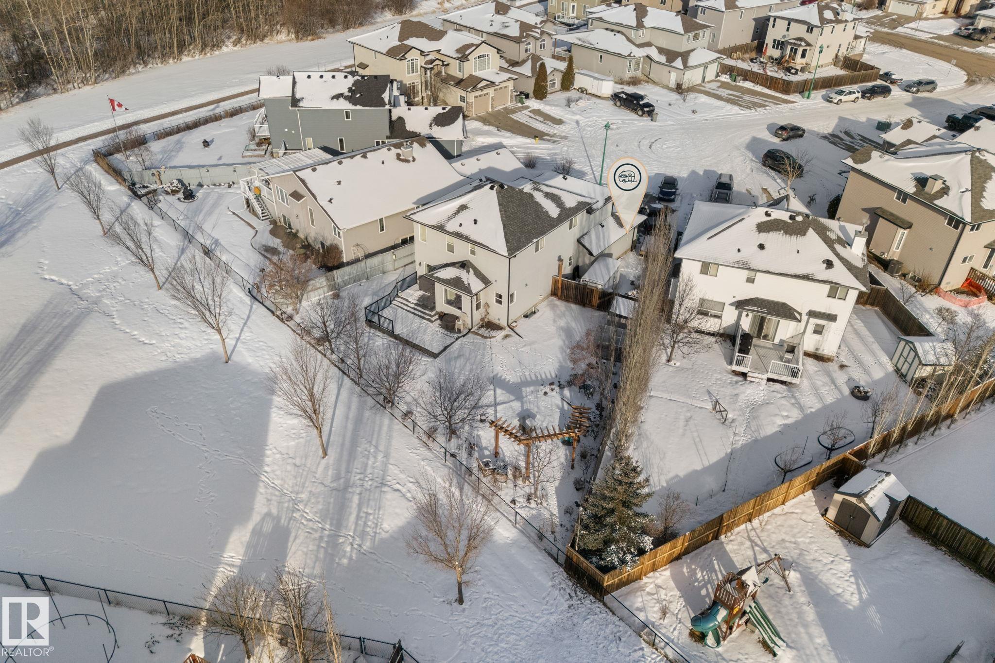 HUGE PIE SHAPED LOT! BEAUTIFULLY MAINTAINED! CHARACTER THROUGHOUT! This lovely home is located in the highly desirable City of Beaumont. It has 3 generous sized bedrooms upstairs with an additional bedroom in the basement. The open concept living space welcomes you with the warmth of the gas fireplace, and includes a huge custom kitchen with plenty of storage and second oven for your cooking dreams. Right off the dining room you'll find a large composite deck leading you to a beautifully landscaped backyard, backing green space, with a fireplace patio and plenty of perennials to enjoy. Stainless steel appliances in the kitchen, full laundry room with sink on the main level, oversized double car garage, RV Parking, bonus room, fully finished basement and more. NEW SHINGLES in 2025, pergola in the backyard, greenhouse, newer furnace & hot water tank. Don't miss out - this one won't last long!