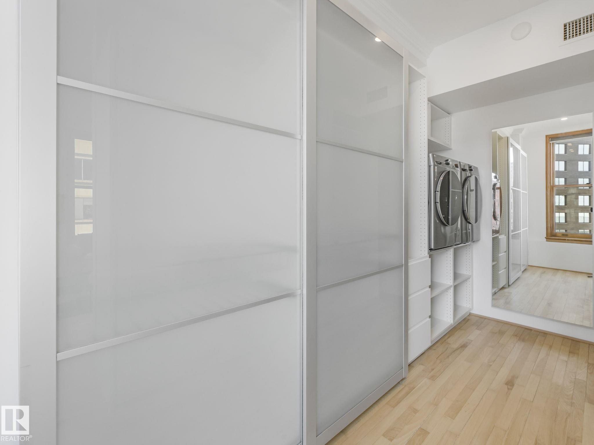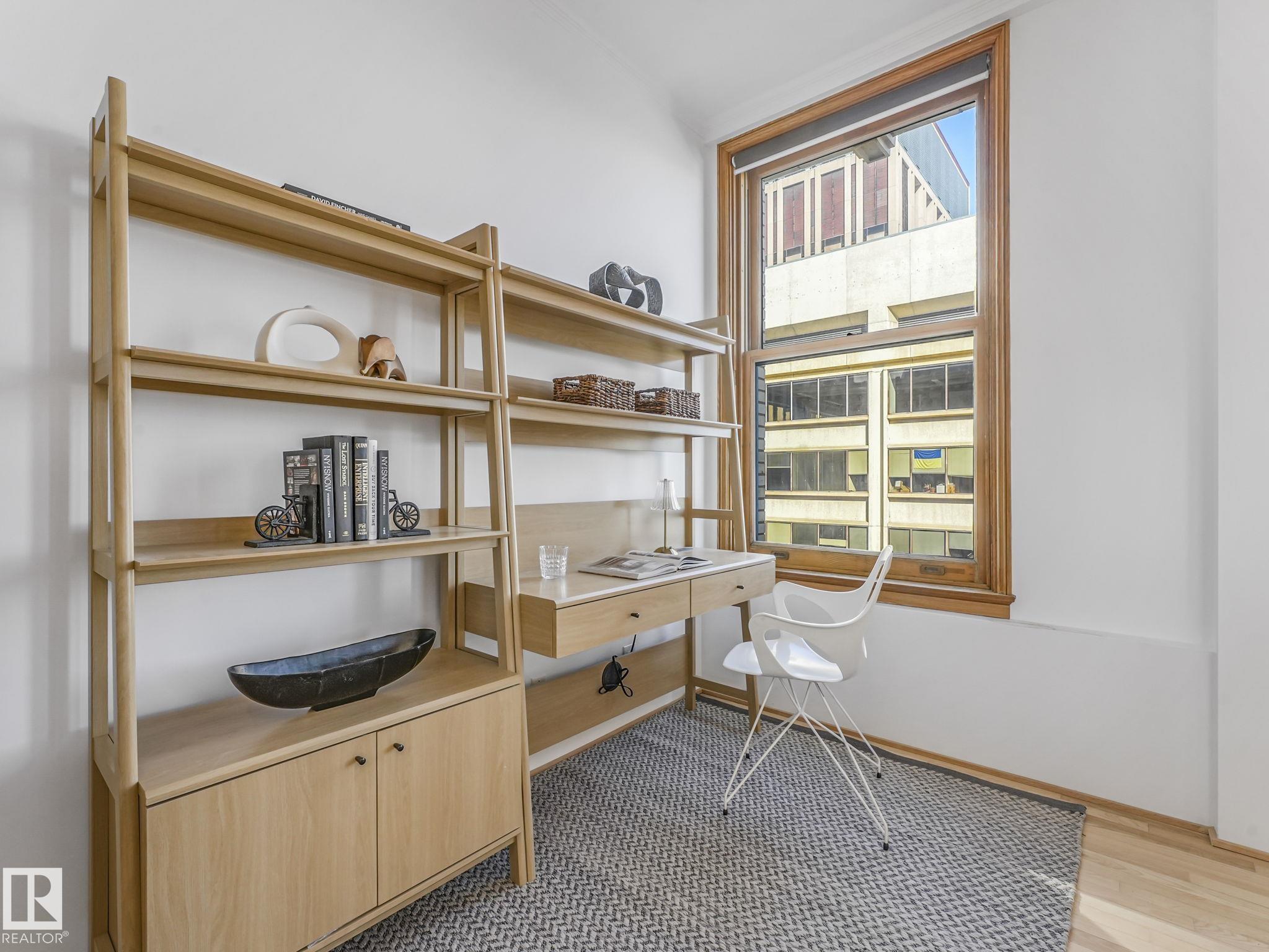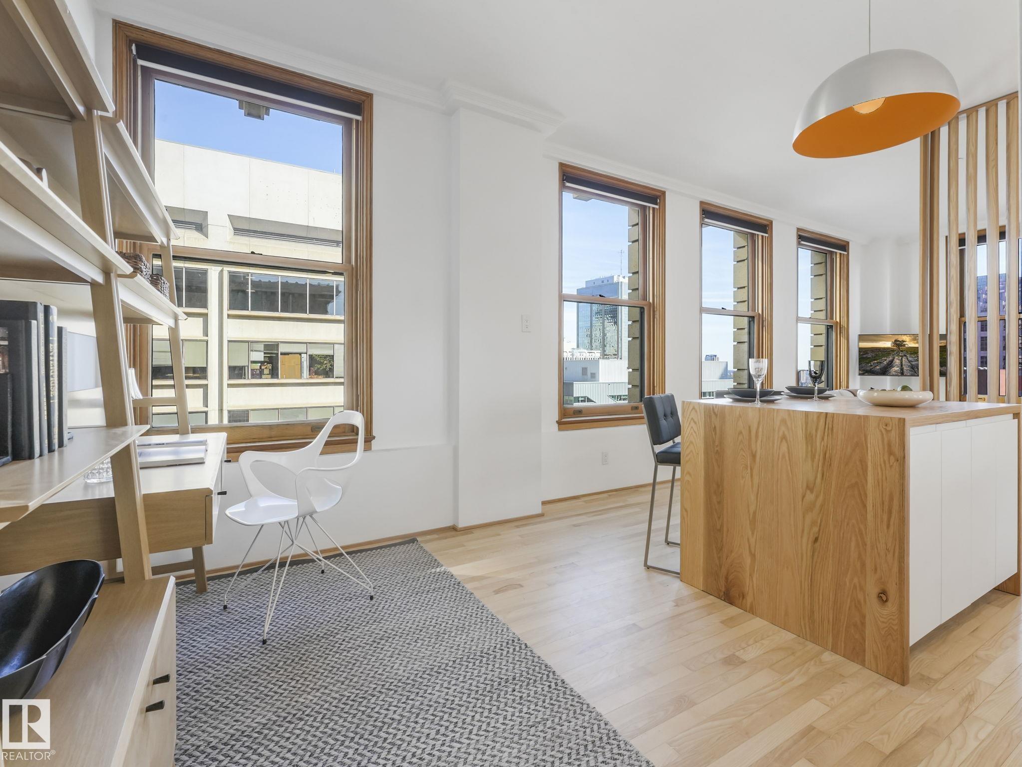 Gorgeous EXECUTIVE LOFT in The McLeod Building. 1915 CHARACTER with CONTEMPORARY VIBE in the CORE! This UNIQUE CORNER UNIT on the 8th FLOOR (sub-penthouse) features soaring 9.5 FT Ceilings, Hardwood Flooring & SEVEN 84”High Chicago-style windows that flood the space with natural light… all c/w MOTORIZED BLINDS! The CLEAN LINE KITCHEN features a new electric downdraft stove, an integrated fridge, low-profile microwave/hood fan & a commercial grade built-in Ice-maker. Island has casual seating and is ideal for both serving & entertaining while providing bonus storage space! THE BRAND BEAUTIFUL CUSTOM MADE Murphy Bed/Wall system easy tucks up to give you a nice living area. Bathroom features a LARGE LUXURY STEAM SHOWER. Amazing WALK-IN CLOSET WARDROBE AREA WITH NEW IN-SUITE LAUNDRY! GREAT CITY VIEWS and STEPS FROM LRT, Great Restaurants, Art Gallery, Shopping, Rogers Place & River Valley trail system & more! All-Inclusive CONDO FEE INCLUDES ELECTRICAL, HEAT (GAS), WATER, SEWER, Res-Fund, Pro-Mgmt, Ext-Maint.