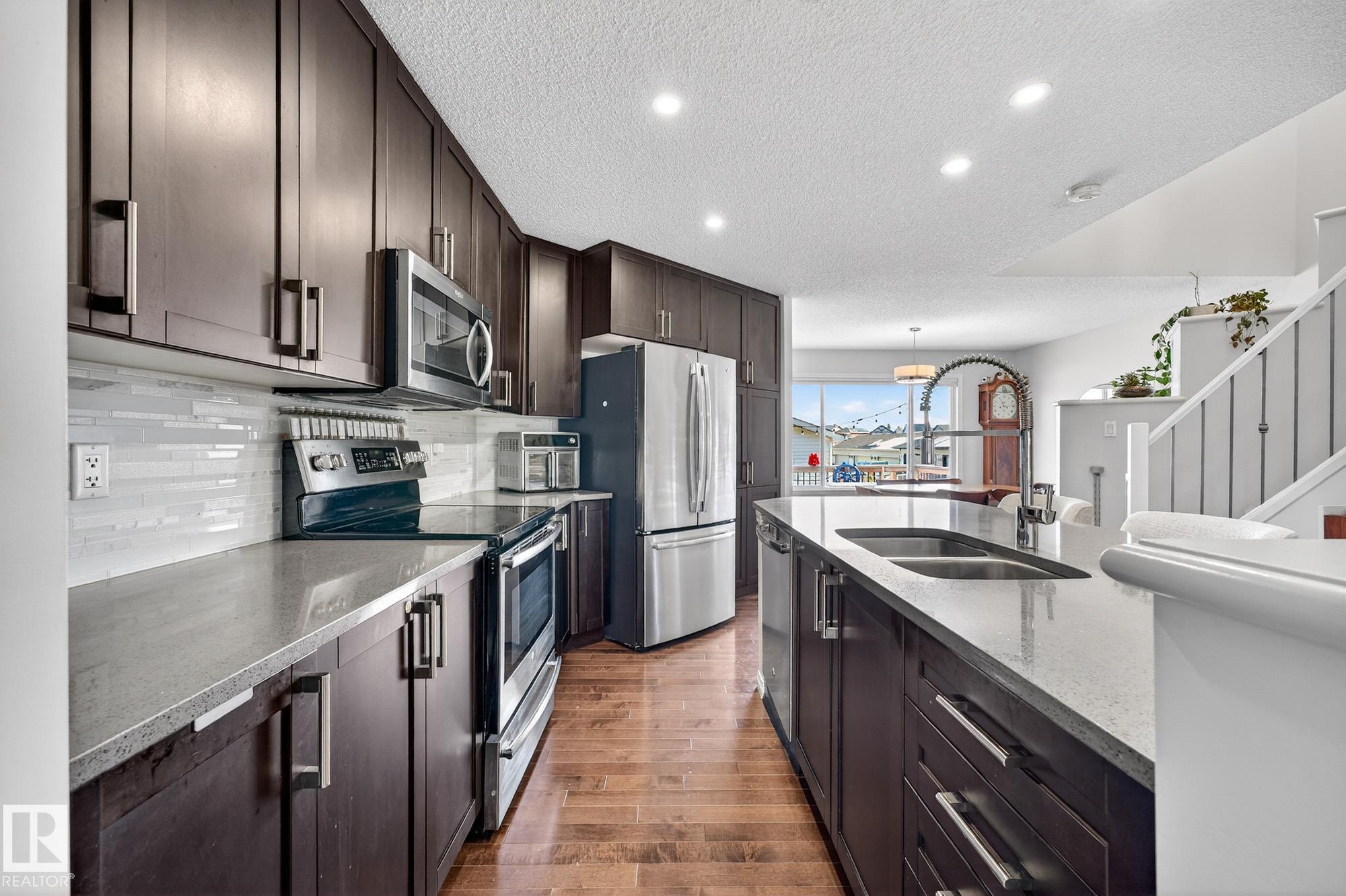 Discover this exceptional 4-bedroom family home located near scenic ravine and walking trails. The open-concept main floor is highlighted by an oversized living room with 9' ceilings and a stunning curved staircase with metal railings. A chef-inspired kitchen offers full-height cabinets, a custom built-in pantry, and a large island with an integrated eating bar. The upper level boasts a spacious primary suite complete with a 5-piece ensuite and a walk-in closet, alongside the convenience of an upstairs laundry room. The fully finished basement, provides an inviting second living area, a large Bedroom and a full bath featuring a tiled wall shower. Outdoor living is a highlight of the home, featuring a 20'x 10' raised deck, gas BBQ line, gravel patio, creating the perfect setting for memorable family nights and summer entertainment. Situated within walking distance to premium commercial amenities, including cafes, restaurants, and grocery stores, this home perfectly balances luxury and daily convenience.