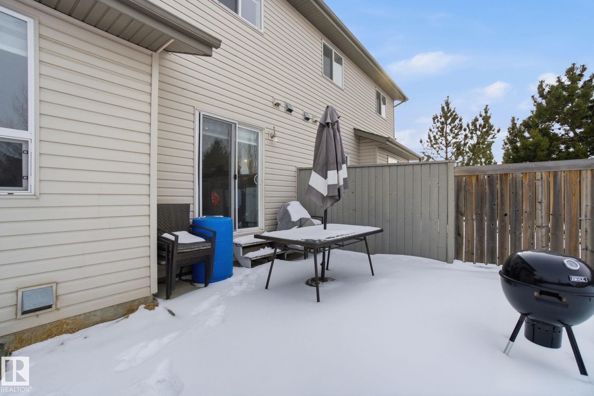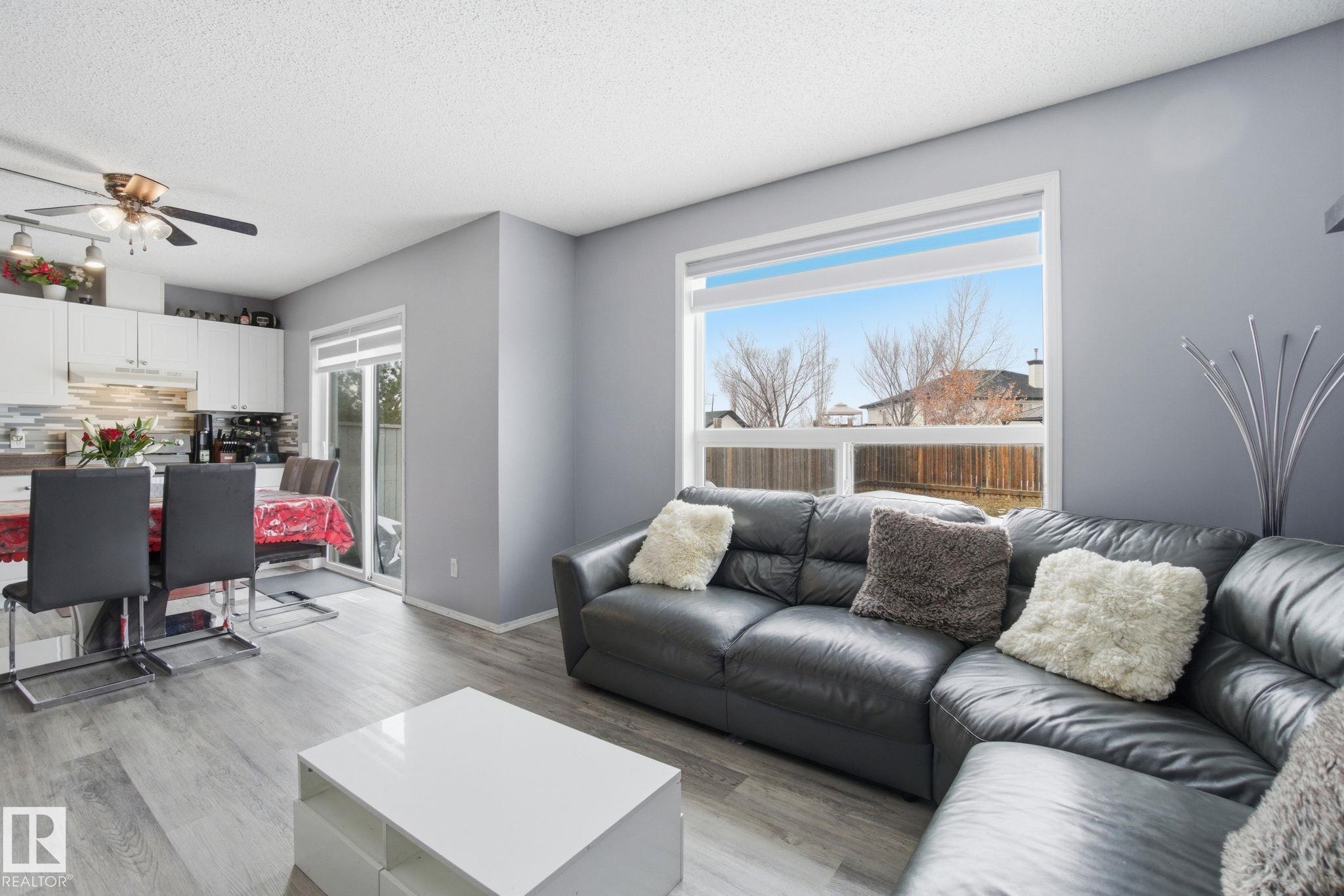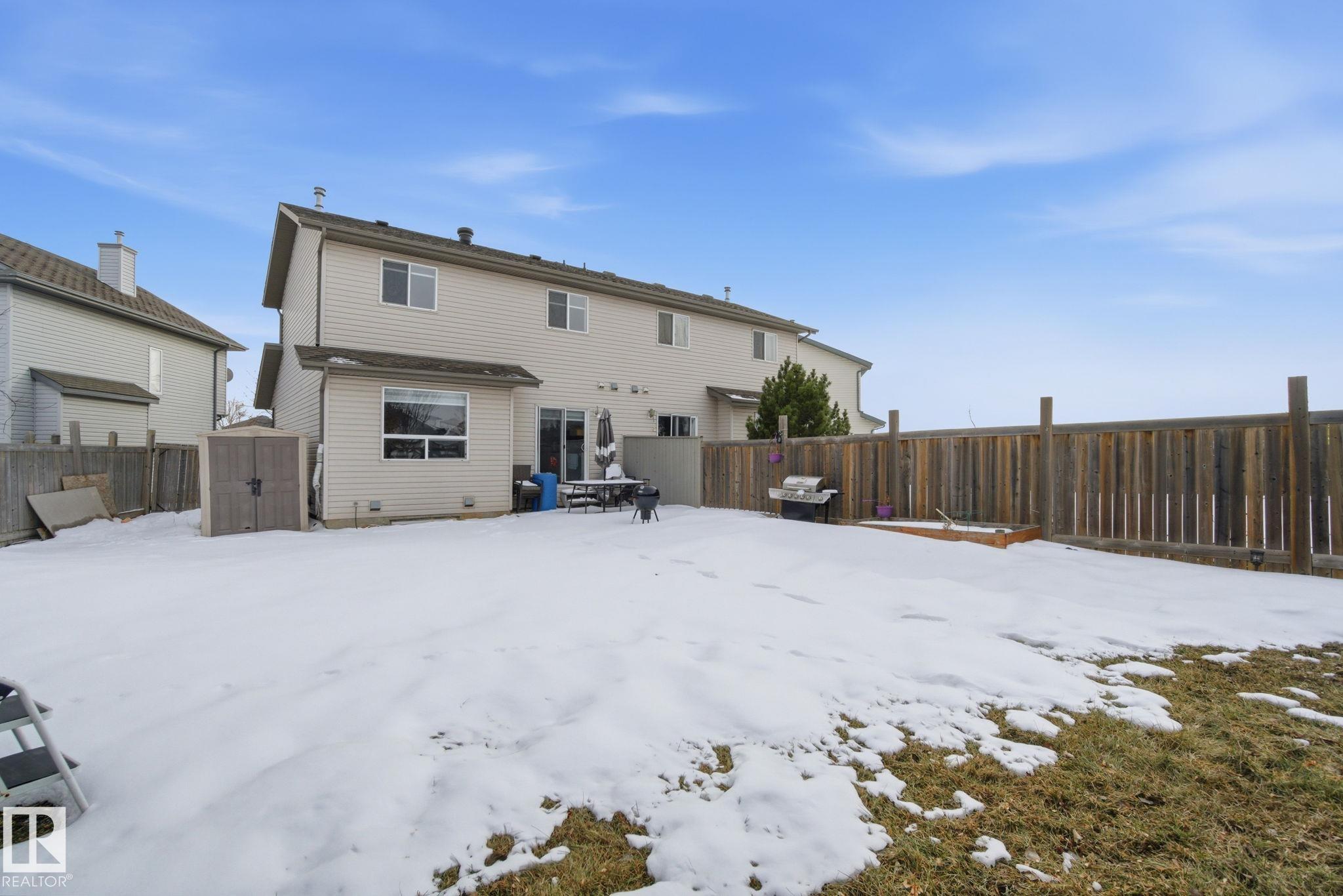 Welcome to this beautifully updated half-duplex, perfectly located in a quiet, family-friendly cul-de-sac with no through traffic! Move right in and enjoy a freshly painted interior with new vinyl plank flooring throughout. The home features an open kitchen and living area, three spacious bedrooms upstairs, plus a fully finished basement complete with its own full bathroom. You will love the everyday convenience of the attached garage, but the true standout is the massive pie-shaped lot, offering a spectacular backyard oasis rarely found with a duplex. The location is excellent. You are within easy walking distance to schools, playgrounds, and churches, while multiple grocery stores and gyms are just minutes away. Commuting is an absolute breeze with immediate access to the Anthony Henday highway, as well, only a quick five-minute drive from St. Albert amenities. Book your showing today to secure this rare find at a great price!