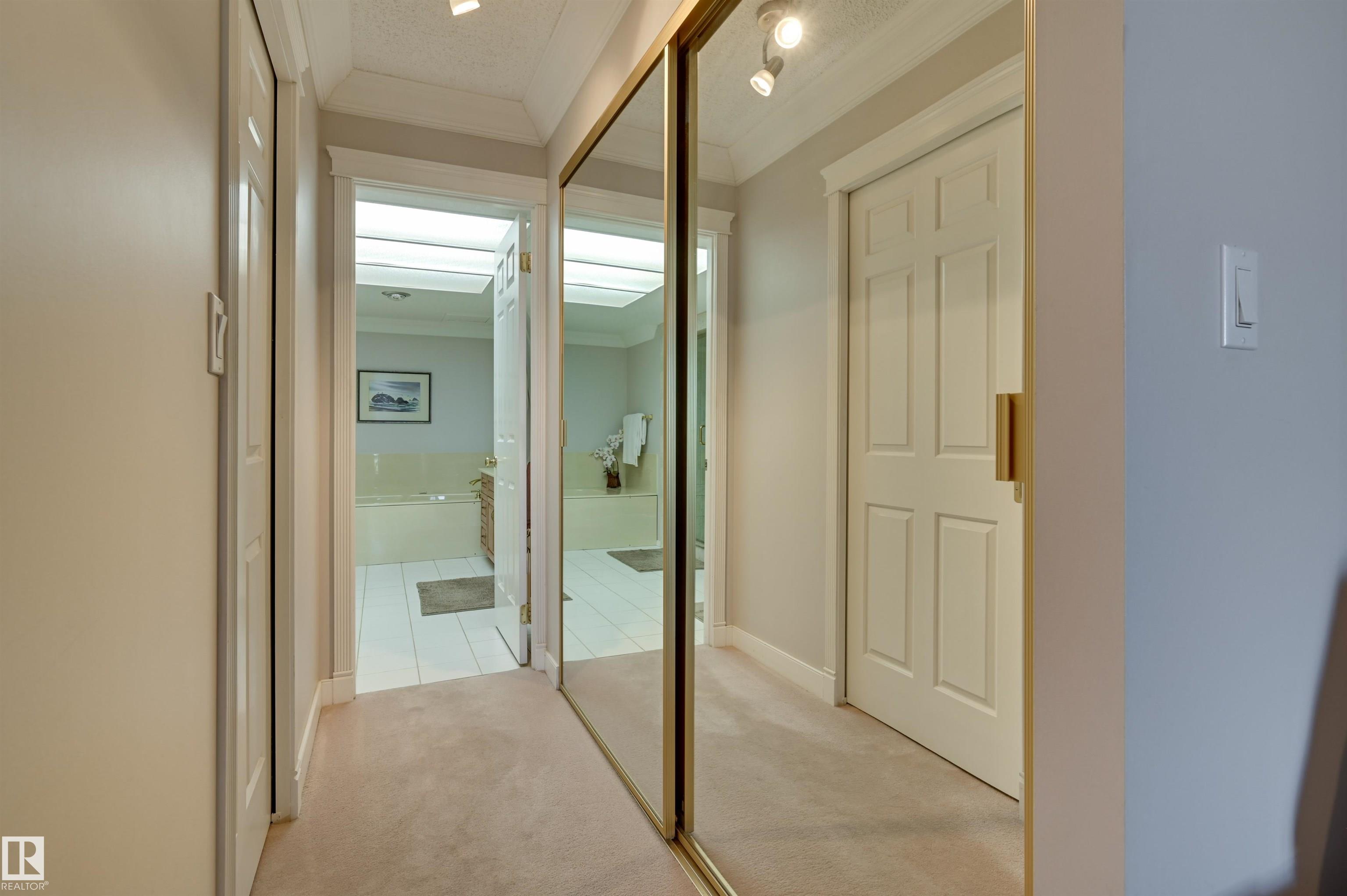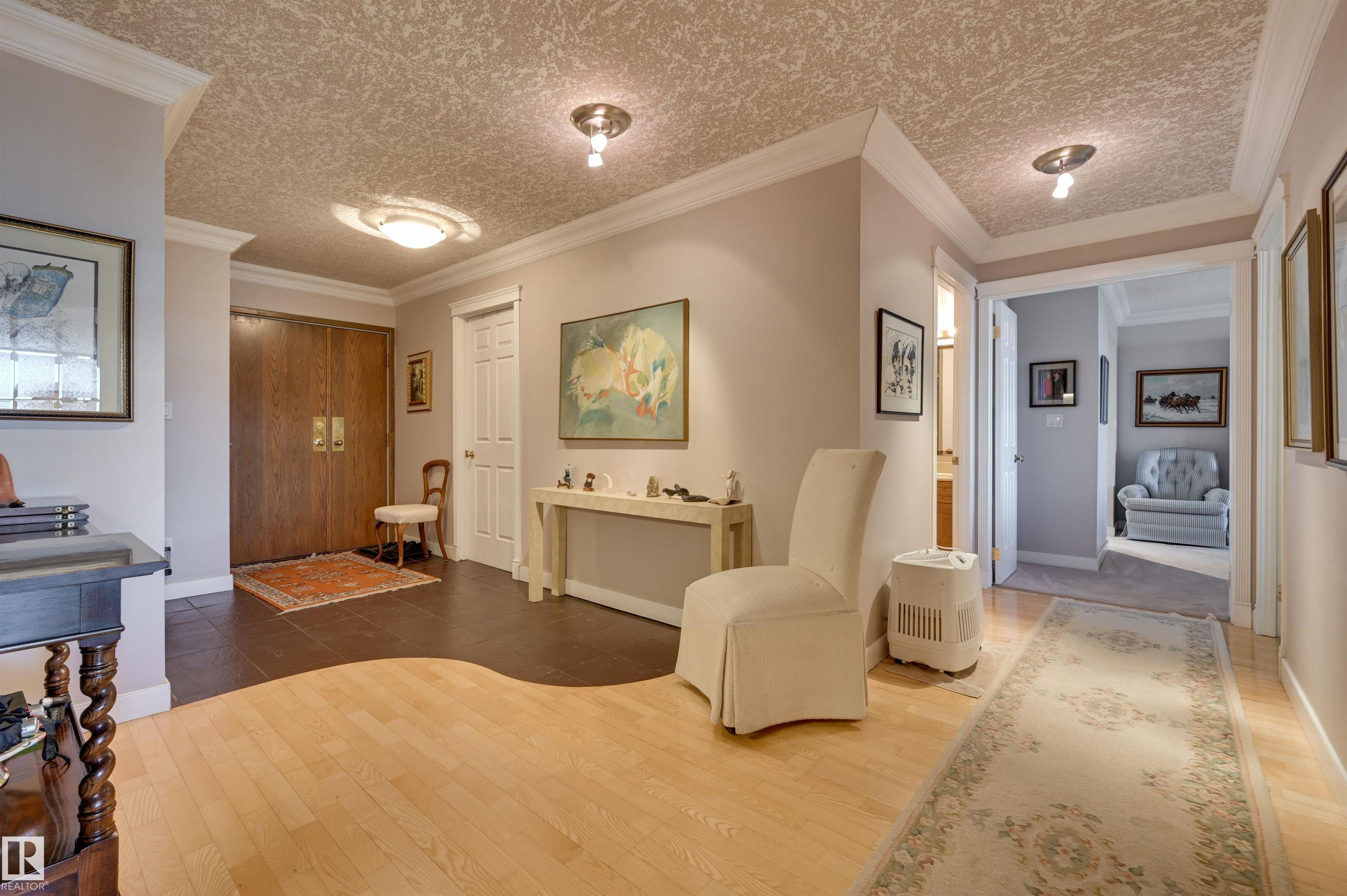 SPECTACULAR RIVER VALLEY VIEWS from this 1915 sq.ft. 2 bedroom + den, 2 bathroom condo in the sought after LEMARCHAND TOWER conveniently located close to the river valley trails, transportation & quick access to shopping, restaurants, coffee shops, the Brewery & Ice Districts. RENOVATED unit with a gourmet kitchen open to the living area featuring cherry wood cabinetry with plenty of pull out drawers offering lots of storage, a raised eating bar, granite countertops, built-in desk & a walk-in pantry. Formal dining room. The living area has a corner electric fireplace & built-in cabinets for the TV with pull out drawers. Double french doors to the den. The 2nd bedroom is across from the 4 piece bathroom. The spacious primary bedroom suite has a walk through closet to the 5 piece ensuite bathroom that has a jacuzzi tub & walk-in shower. Crown moulding throughout, hardwood flooring, carpeting in the bedrooms. 2 large U/G PARKING with storage over 1 stall. Guest suite, party room w a patio. Shows well