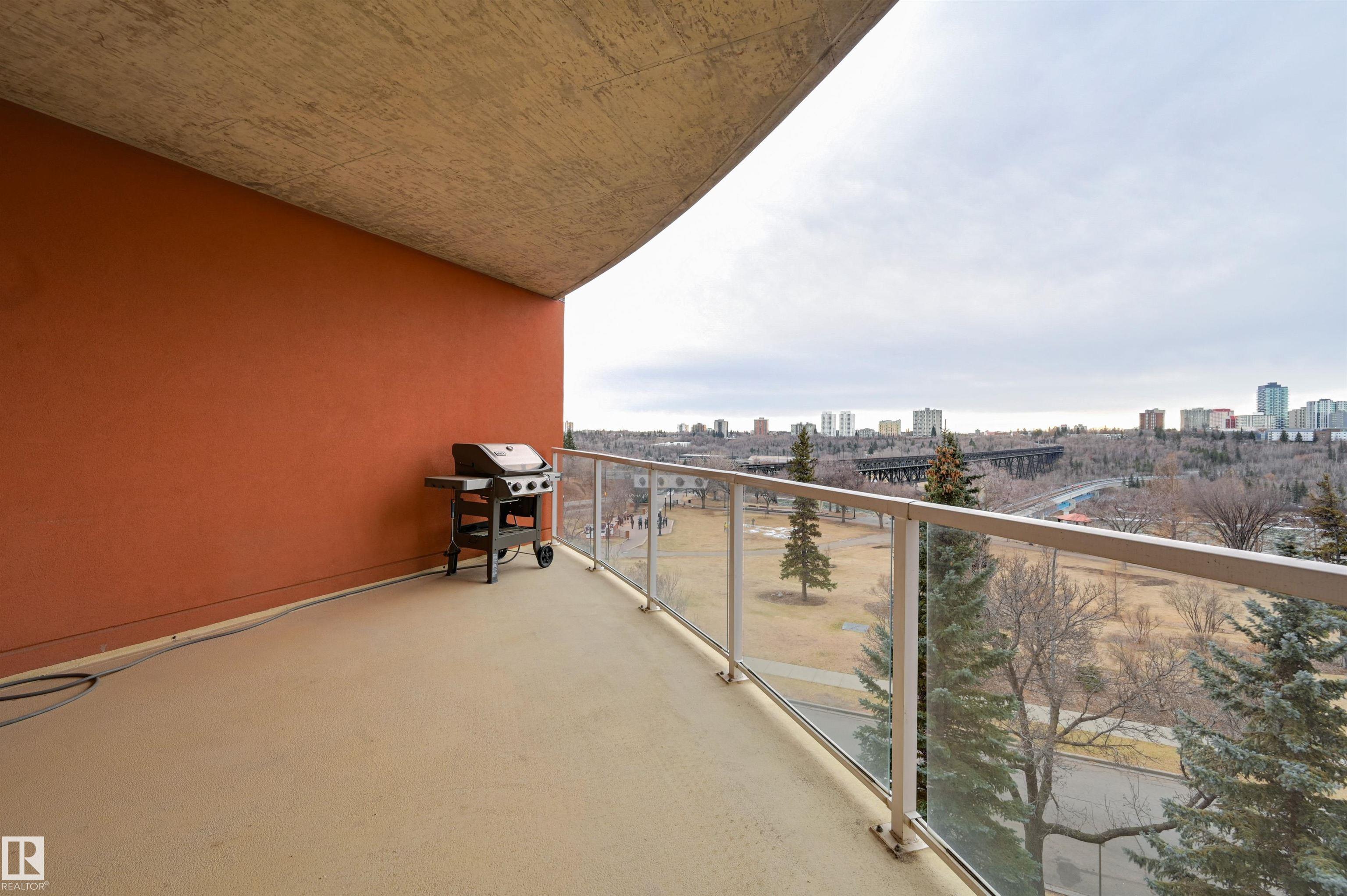 SPECTACULAR RIVER VALLEY VIEW from this 1559 sq.ft. 2 bedroom + den, 2 bathroom southwest CORNER UNIT in RIVERVIEW GREEN conveniently located with the river valley trails & the LRT at your doorstep & close to shopping, the Ice District & quick access to the U of A. Modern open floor plan with 9' ceilings, floor to ceiling windows, gas fireplace, & spacious balcony with great views & a gas BBQ outlet. The kitchen features maple cabinetry, white appliances, a pantry & access to the northwest facing balcony. Next to the living area is a den. The 4 piece main bathroom is next to the second bedroom. The primary suite has a 5 piece ensuite bathroom with a soaker tub, walk-in shower & double vanity. UNDERGROUND PARKING #47 on P1 & an extra storage locker #39 on P2. Riverview Green is a Green building with high efficiency heating & air exchange & fresh air intake for each unit + exceptional sound proofing. Amenities include a fitness & party room, library, guest suite, car wash & workshop. PET FRIENDLY.