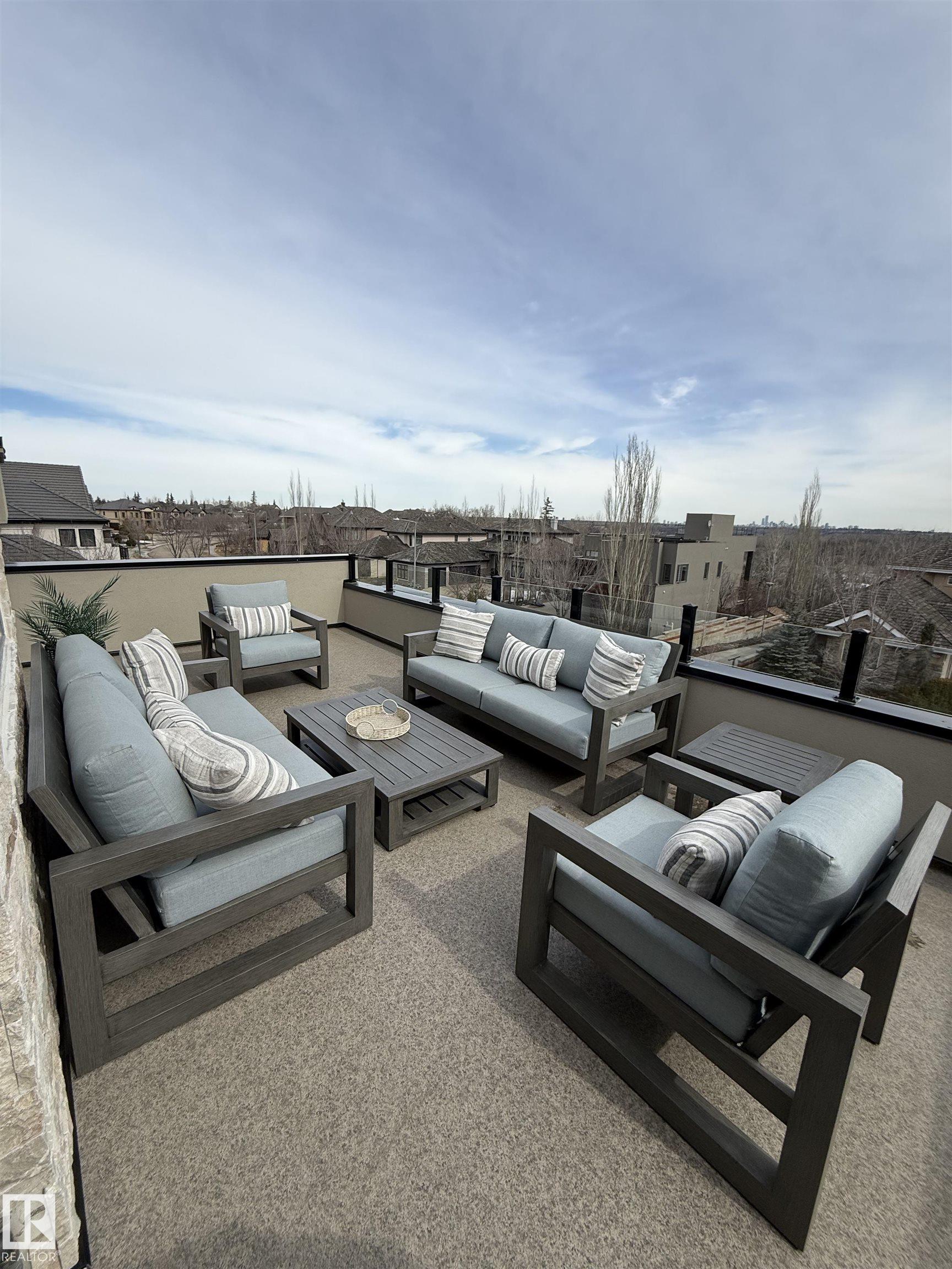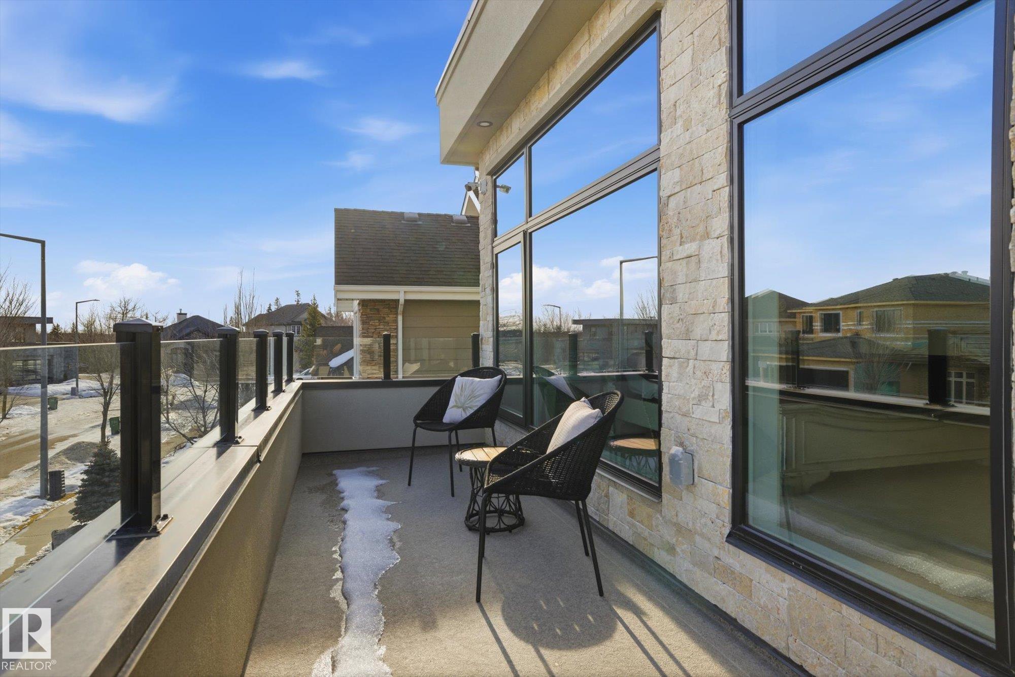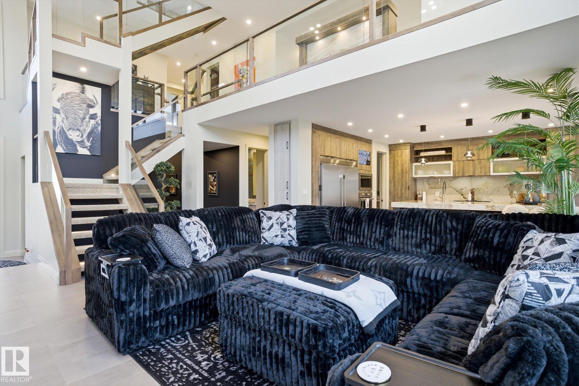Spectacular City View from the roof top in this Contemporary Executive home in family friendly Cameron Heights. Steps to ravine, river, pond & outdoor rink. Luxury finishes throughout. 19' ceilings welcomes you through this naturally lit, open floorplan w/beautiful craftsmanship. Open to above great room features a custom linear fireplace feature wall & ceiling detail. Oversized kitchen w/ample storage, upgraded appliances, exotic stone, secondary prep kitchen, extended cabinetry & beverage station. 16' dining nook w/direct access to deck for evening bbqs. Main floor bedroom w/ensuite for convenience. Home office w/dual entry, mudroom, powder room & oversized triple garage complete this level. Glass railing staircase & open treads leads you to upper levels highlighting a bonus room, spacious laundry room & 3 bedrooms each w/ensuites including a 640sf primary suite w/private balcony. Trendy upper loft provides a large lounge area, wet bar, 2 sided fireplace & access to private rooftop balcony. Shows a 10!