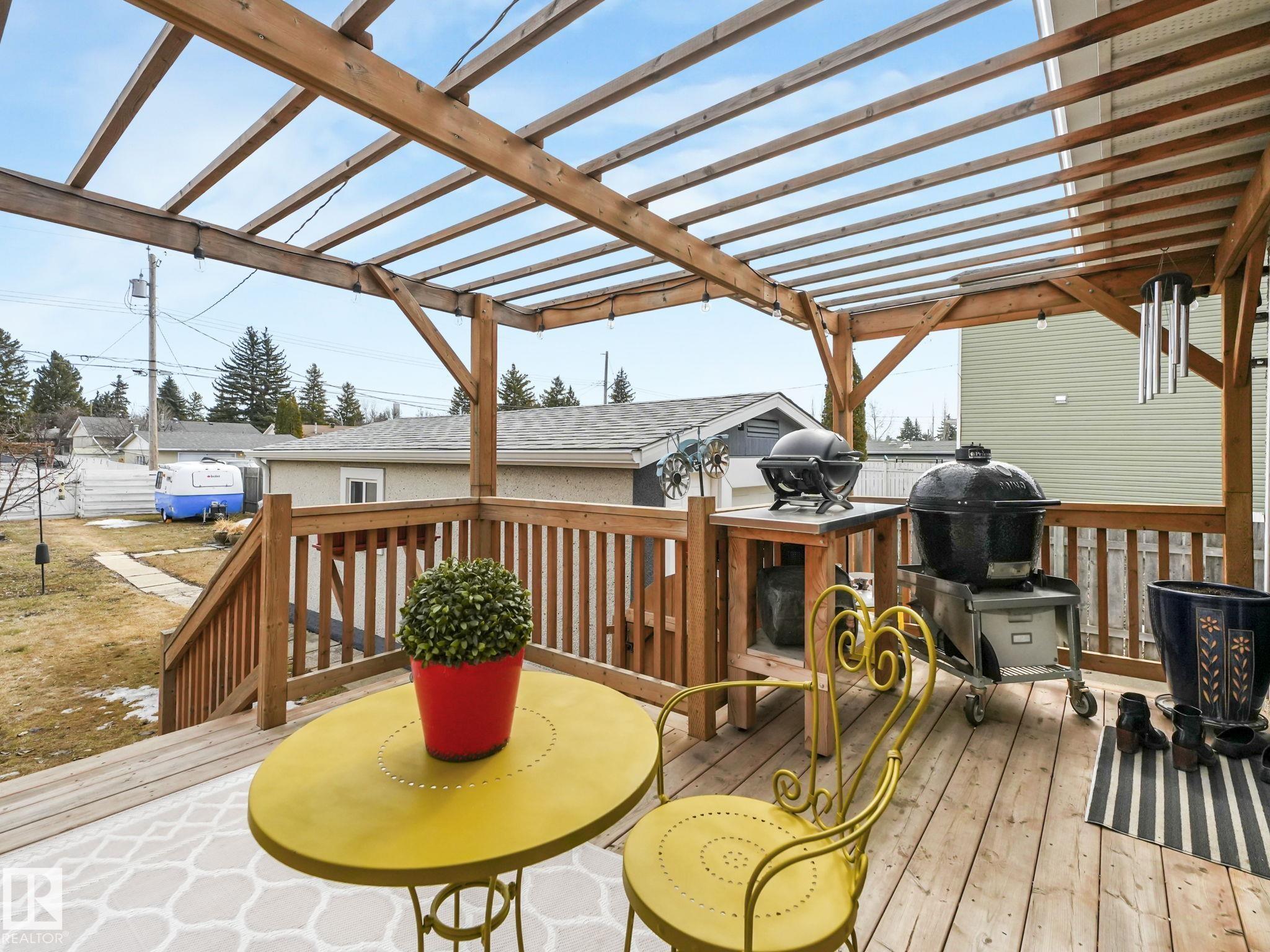 Welcome to this charming, classy, and beautifully renovated home in the family-friendly community of Glenwood! Situated on a large 50 x 146 ft lot, this move-in ready property has been updated top to bottom. The main floor features a bright living room with fireplace, 2 spacious bedrooms, stylish kitchen, dining area, and access to the large east-facing deck with Sunbrella canopy. Gorgeous hardwood and ceramic tile add warmth and elegance throughout. The fully finished basement with separate entrance offers a self-contained suite with family room, bedroom, second kitchen, and full bathroom—ideal for extended family. Upgrades include newer furnace, shingles (2020), hot water tank (2020), front window (2020), updated kitchen, renovated bathroom, brand new oven, and new blinds. Enjoy the spacious southeast backyard with mature apple and sour cherry trees, black currant bush, rhubarb, and firepit area. Single detached garage and RV parking. Just 3 doors from Allin Park.