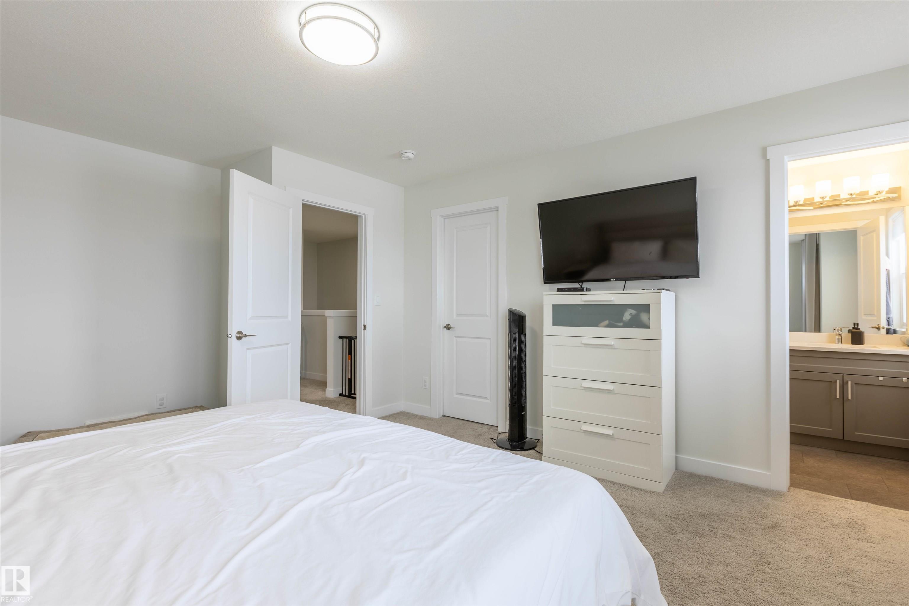 Welcome to this like new half duplex in Morinville, offering small-town living with quick access to city amenities and CFB Edmonton. The open concept main floor features a modern kitchen with quartz countertops, a walk-in pantry, and plenty of workspace, flowing into the dining and living area with an upgraded fireplace and mantel. Step outside to enjoy the natural gas BBQ hookup. Upstairs includes a spacious primary bedroom with a 4 piece ensuite and walk in closet, plus two additional bedrooms and a convenient laundry room with sink and cabinetry. The basement offers a separate side entrance and finished entertainment space. Complete with A/C and a double attached garage.