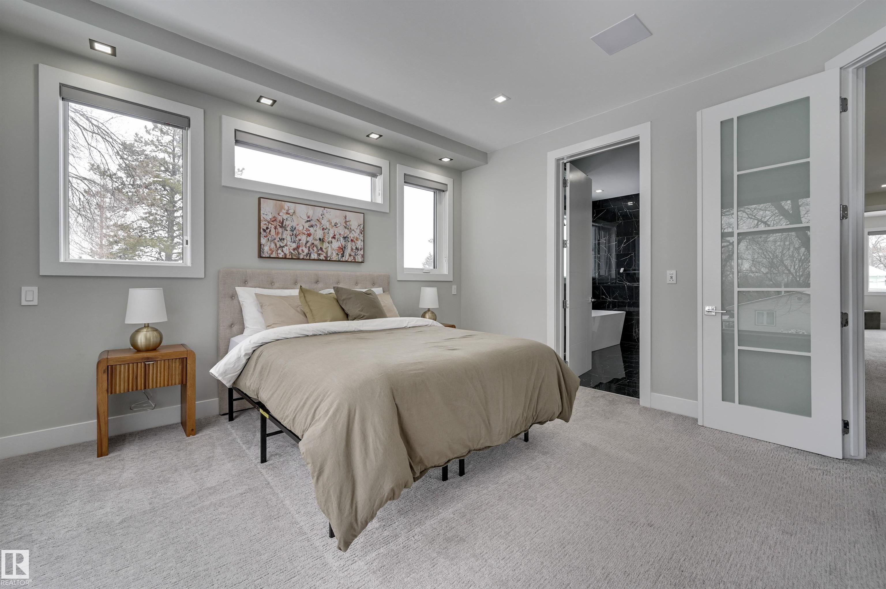 Welcome to Strathcona! This gorgeous 5 bed + 3 bath home is modern luxury at its finest. Step inside your front door + into your open concept main floor. Sunlight pours through your windows into your luxe living room with a gas fireplace. Your custom kitchen with fully integrated Thermador appliances is a chefs dream. Walk up your open riser staircase to your primary bedroom with a spa-like ensuite, steam shower + walk-in closet. 2 spacious bedrooms, a 5-piece bathroom + laundry complete this level. Your 3rd level rooftop patio with composite deck + stunning Mill Creek Ravine views is a true private oasis! Host family in your fully finished basement, complete with a family room, 2 additional bedrooms, a full bath + a wet bar, great for entertaining. Enjoy the summer months in your south-facing backyard with a composite deck. Park vehicles in your detached oversized double garage. This thoughtfully designed home is close to excellent schools, beautiful trails + some of Edmonton's best dining!
