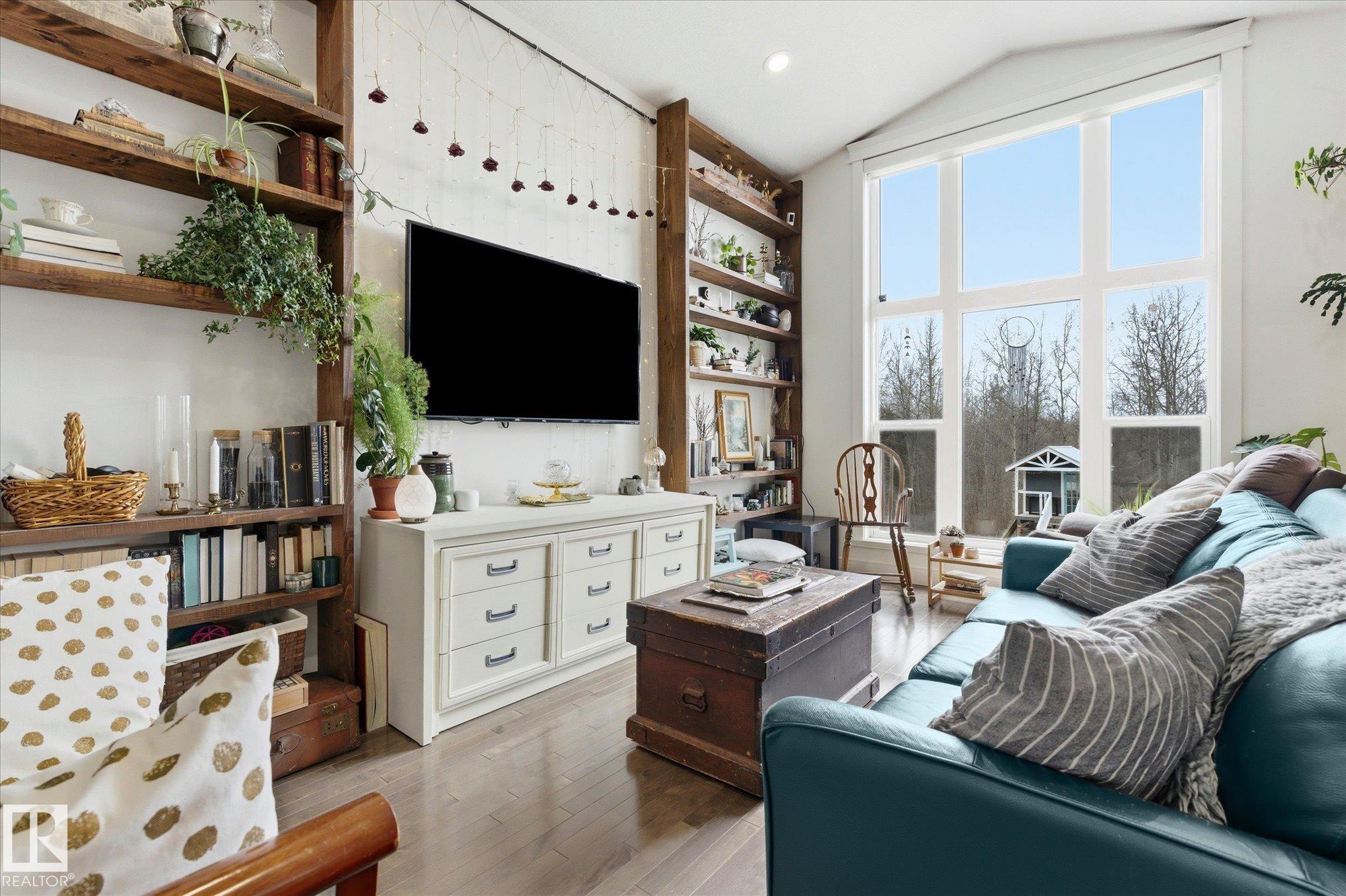 Gorgeous custom-built 1.5 storey walkout on 1.09 private, treed acres backing greenspace, just minutes from Chickakoo Lake Recreation Area. This 5 bedroom, 3 full bathroom home features an open-concept layout with 12’ vaulted ceilings, large windows, and a bright kitchen with island, granite countertops, and corner pantry. The main floor offers 2 spacious bedrooms, while the fully finished basement includes 2 more. The huge primary suite over the garage features a walk-in closet and 4-pc ensuite with dual sinks and a corner jetted tub. Enjoy a cozy gas fireplace, walk-in laundry, dual-zone heating & A/C. Maintenance-free decks overlook a beautifully treed yard with invisible fence. Heated 27’ x 36.5’ triple garage with H/C water and drains. Quick commute to Stony Plain. This one won’t last!
