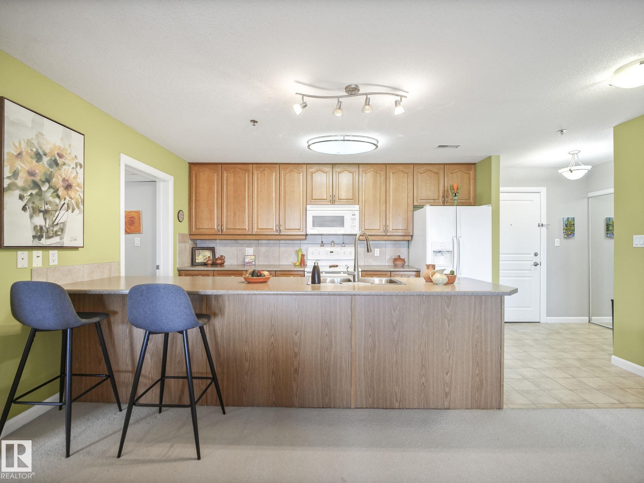 OVERLOOKING THE RAVINE! This modern 2 bedroom and 2 full bath, 18+ unit in the "Ridge At Hermitage" is immaculate! Features include: modern open concept kitchen with expansive breakfast bar, bright and warm ceiling height cabinets, spacious living room, large balcony, large insuite laundry/storage room, central elevators and underground parking stall with storage cage., Main bedroom has a walk-through closet and a 3pc ensuite. 2nd bedroom is next to a 4pc bath and has a custom murphy bed that converts to a desk and filing cabinet(5000. value). Bedrooms are on opposite ends of unit perfect for company/room mate. Parking is close to elevator. Extra features: A/C, visitor parking, car wash, Social and Exercise rooms. All utilities are included in the condo fees, except power Building is PET FREINDLY with board approval close to off leash area. Extensive walking/biking trails, skiing and golf nearby. Quick access to all amenities and major routes!