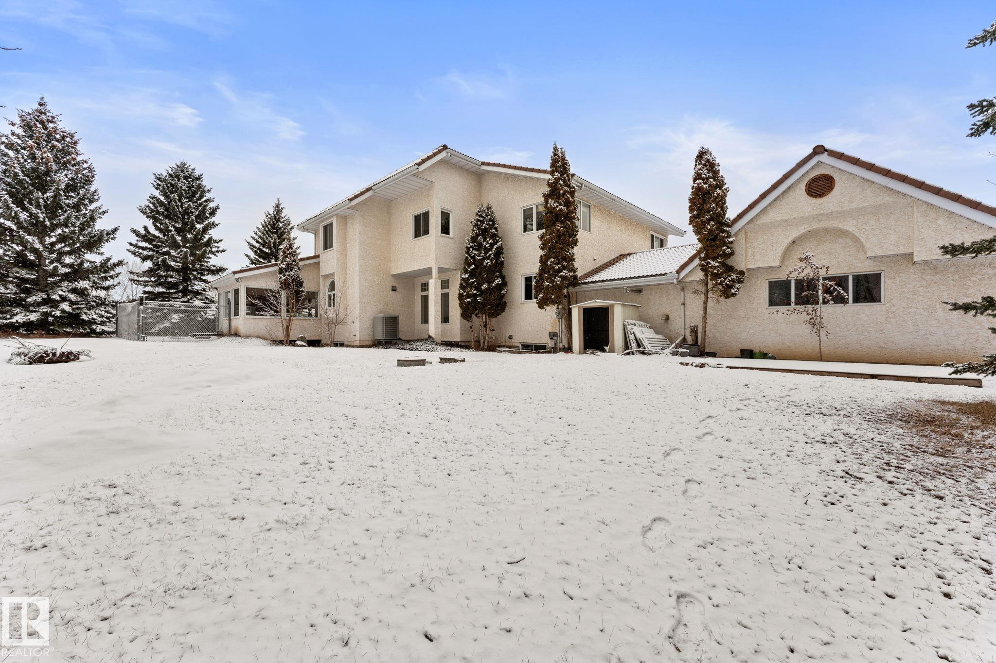 Welcome to this beautiful, 3,000+ sqft property nestled in the highly sought-after Executive Estates, just 2 minutes from Sherwood Park - what a dream! As you turn the corner, you’re immediately greeted by the expansive 3+ acre setting, complete with pasture land, mature trees, and a sense of privacy that makes this property truly special. It’s the perfect backdrop for peaceful country living while still being incredibly close to town. Inside, the home offers a spacious open-concept main floor designed for both everyday living and effortless entertaining. The kitchen features quartz countertops, custom wood cabinetry, and newer vinyl plank flooring. A main floor den provides a great work-from-home space or quiet retreat. Upstairs you’ll find 3 generously sized bedrooms, while the basement boasts an additional oversized bedroom - ideal for guests or a growing family. This home also includes a triple car garage, air conditioning, newer furnaces and hot water tank, and a durable