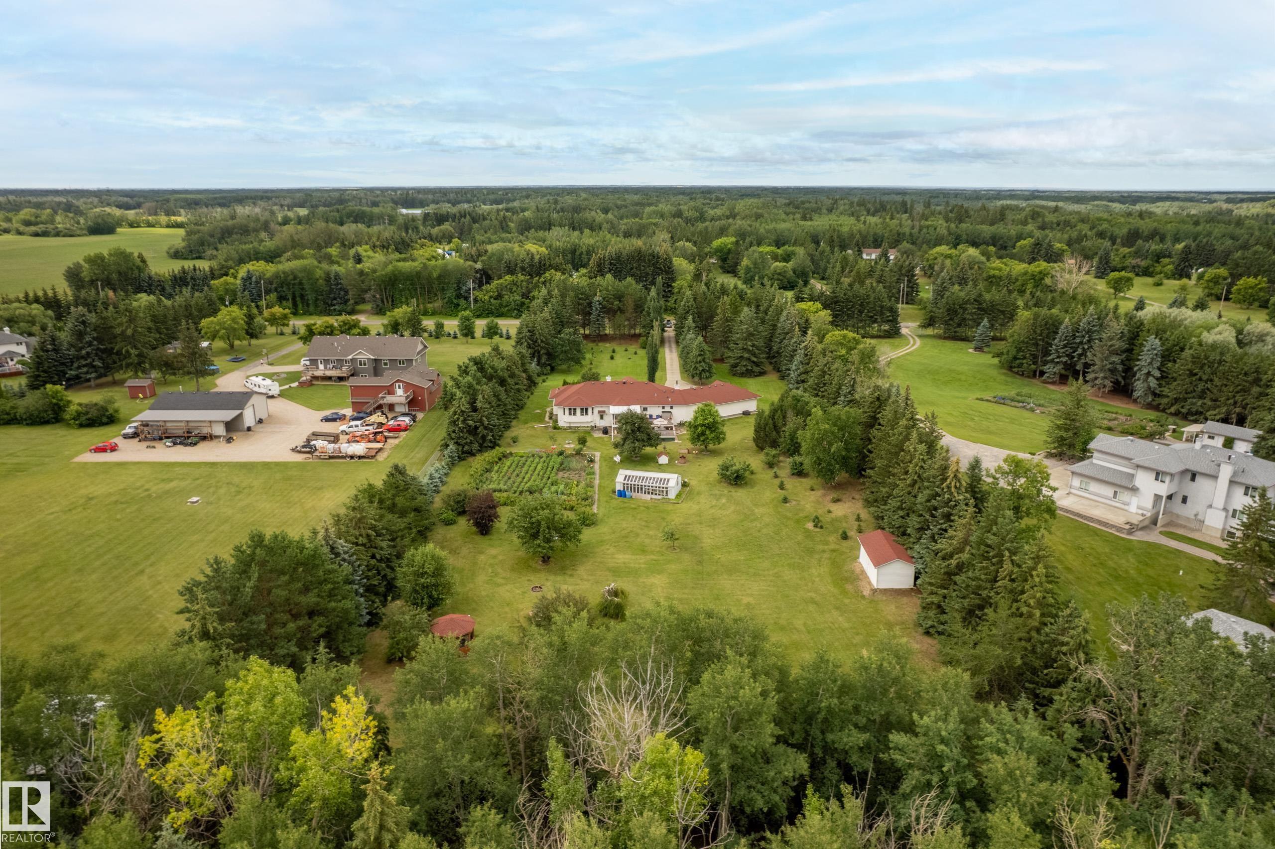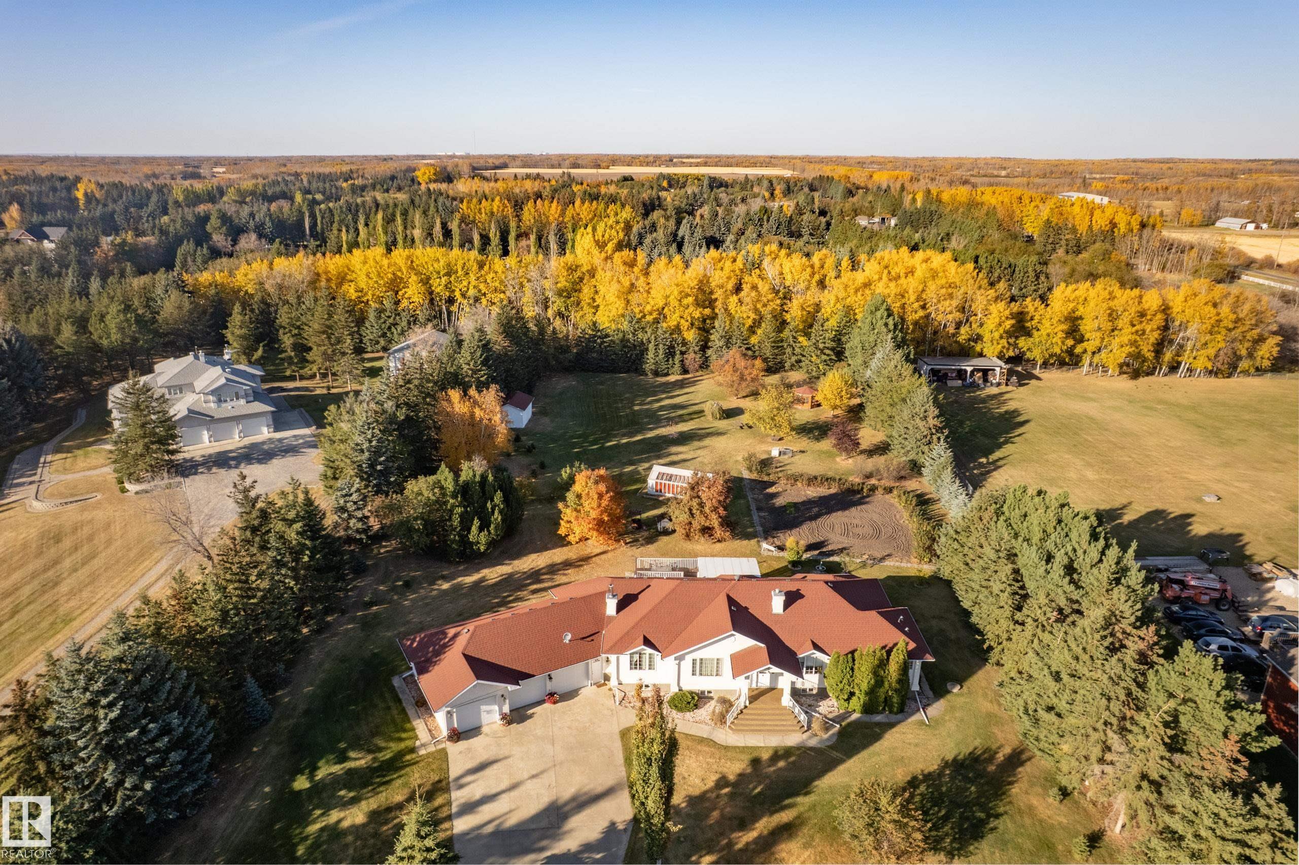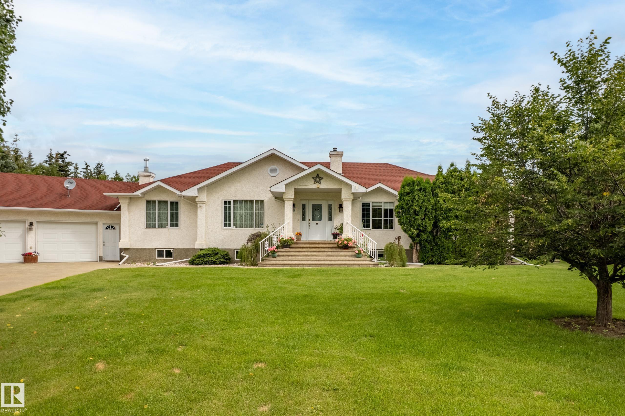Executive acreage offering just over 3 acres, mins from Edmonton city limits. This immaculate bungalow features an oversized 52x23 triple garage, 5 bdrms, 4 baths and convenient main floor laundry, with nearly 4,500 sq ft of living space.. A fully fenced property with an automatic gate and paved driveway provides a grand welcome. Enjoy lush landscaping with a productive vegetable garden and fruit varieties including apple and crabapple trees, Saskatoon berries, chokecherry, and raspberries, plus abundant wildlife. Outdoor living shines with a 3-season sunroom, tiered deck, gazebo and greenhouse with power and storage sheds. The spacious kitchen offers granite countertops, center island, ample cabinetry flowing into a formal dining room and adjoining living room. The primary suite features a 5-piece ensuite. Gleaming hardwood floors throughout. The fully finished lower level includes a large family room, recreation space, wet bar/ second kitchen with full sized stove and fridge. Mins to K-9 Graminia school