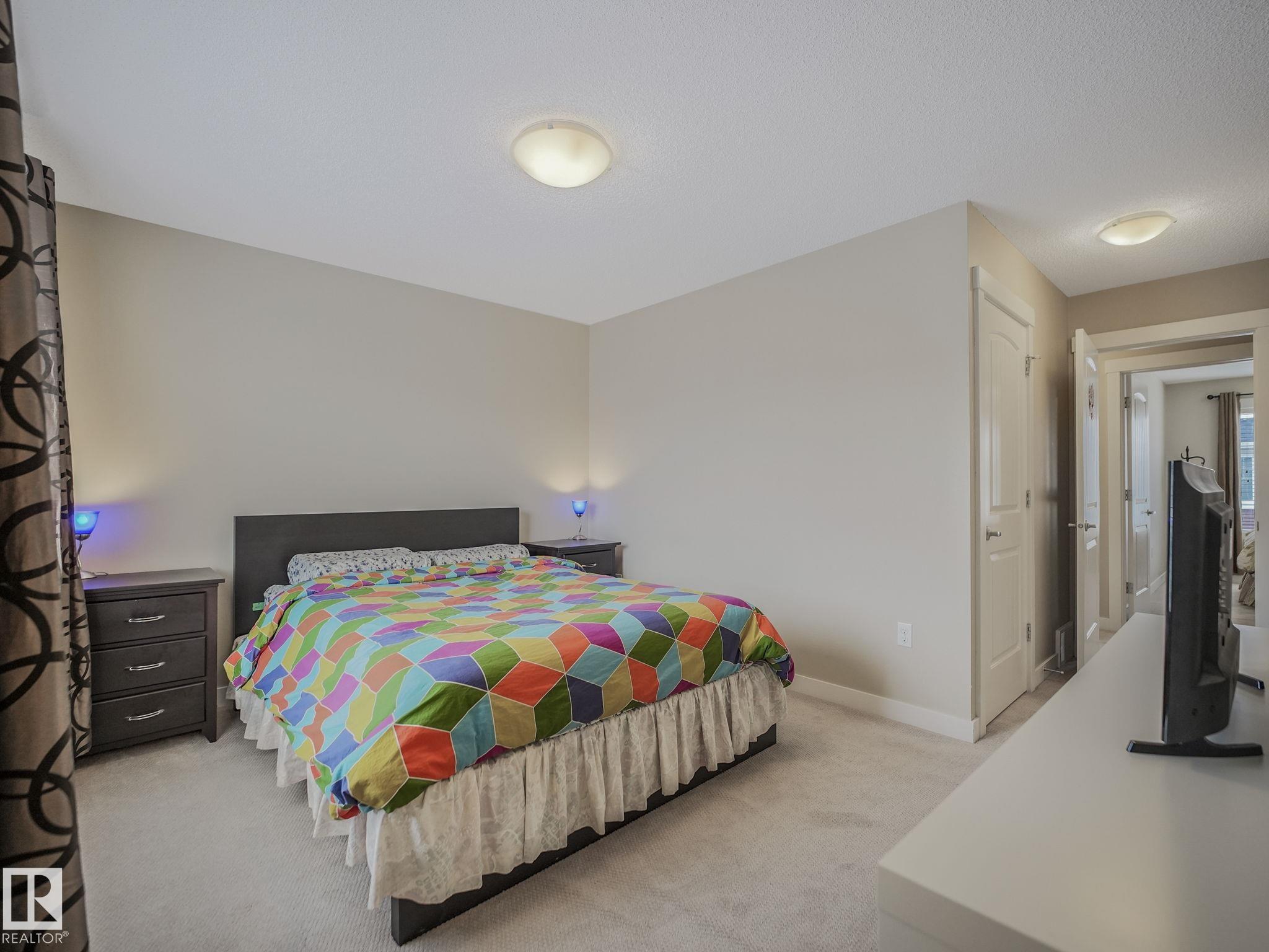 Enjoy low-maintenance living at Mirra at Poplar Lake. This well-appointed 3-storey townhouse features 3 bedrooms, 2.5 bathrooms, and a double attached garage. The open-concept main level is enhanced by 9-foot ceilings and a modern kitchen complete with ceiling-height cabinets, stainless steel appliances, quartz countertops, a large island, pantry, and abundant storage. Spacious dining and living areas make entertaining easy, while the west-facing balcony with gas BBQ hookup offers a perfect outdoor retreat. Upstairs, the primary bedroom includes a full ensuite and dual closets, alongside two additional bedrooms, a second full bath, and convenient upper-level laundry. Located in desirable Klarvatten near Poplar Lake, walking trails, schools, shopping, and Anthony Henday access, this home is ideal for buyers looking for style, convenience, and low condo fees.