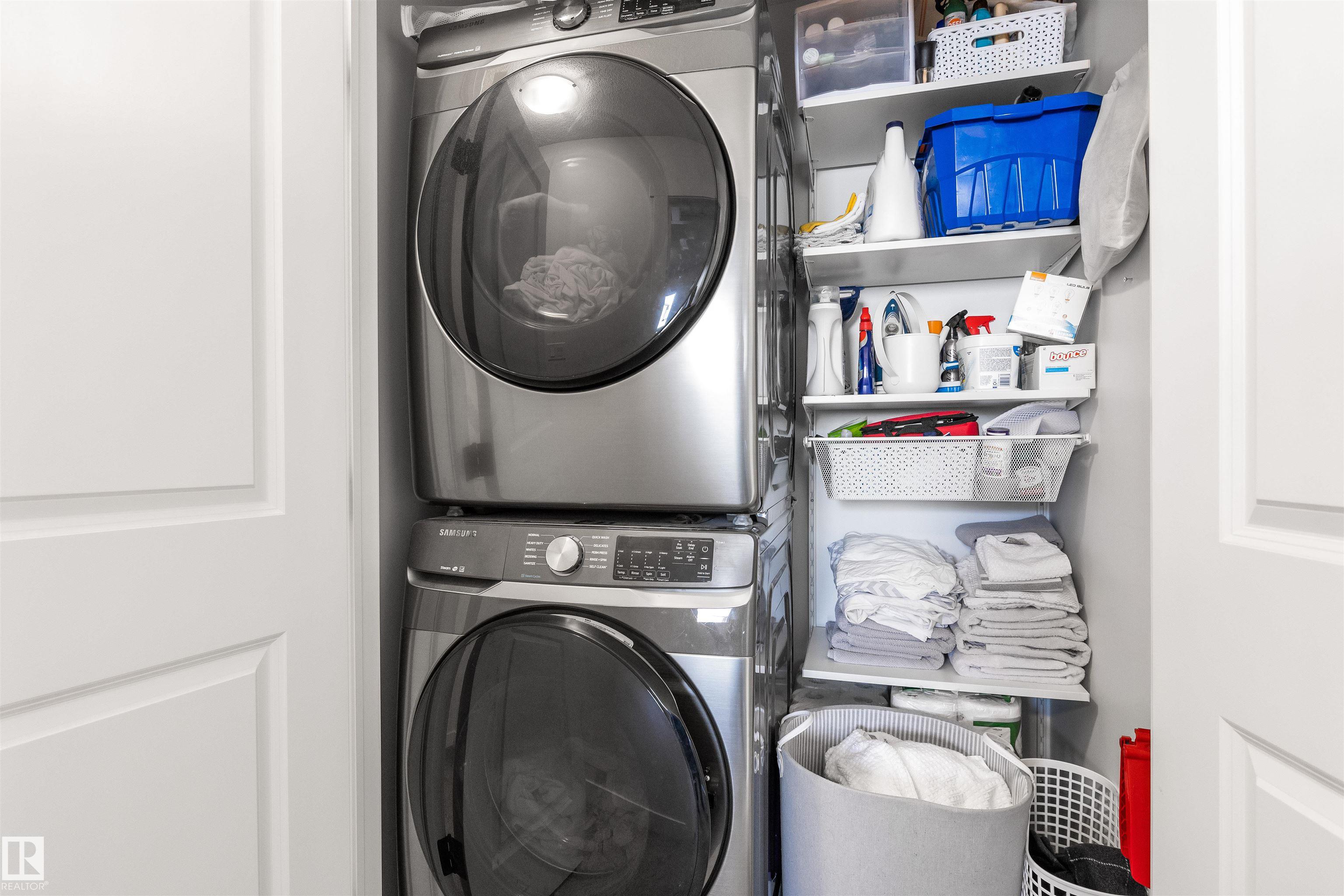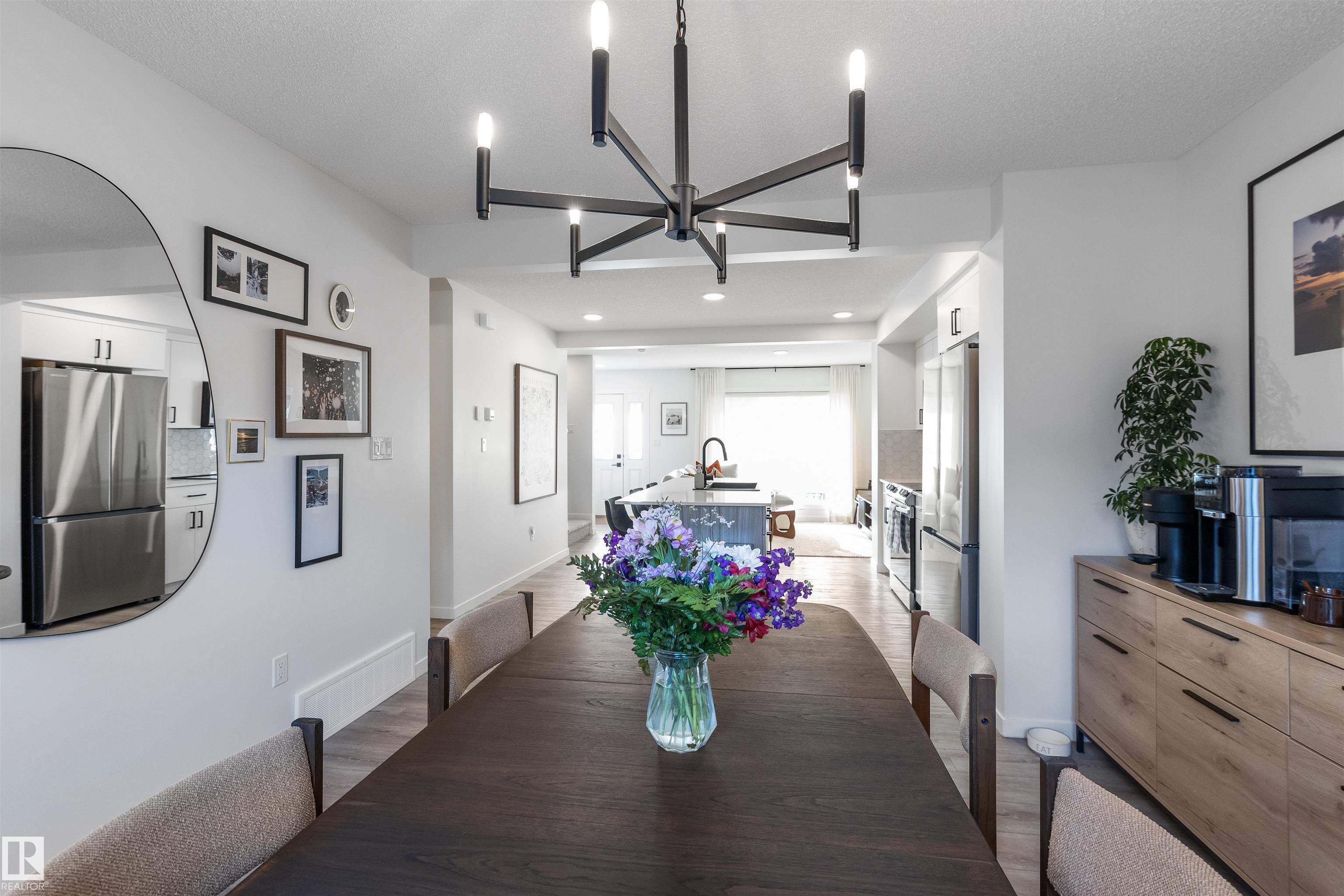 Step inside this beautiful home by StreetSide Developments and enjoy the seamless flow of the open-concept main floor, filled with natural sunlight from large windows throughout. The cozy front living room leads into a bright kitchen featuring ceiling-height white cabinetry, Samsung stainless steel appliances, quartz countertops, a large island with eat-up seating, and a black composite sink. The spacious dining area overlooks the fully landscaped backyard, complete with a dog run. Upstairs offers stacked laundry, two generous bedrooms, a 4pc bath, and a primary retreat with a walk-in closet and 4pc ensuite. The unfinished basement is ready for your personal touch. BONUS features include a double detached heated garage (120V dedicated breaker), A/C, and NO CONDO FEES. Located steps from schools, parks, trails, and amenities—this home is move-in ready!
