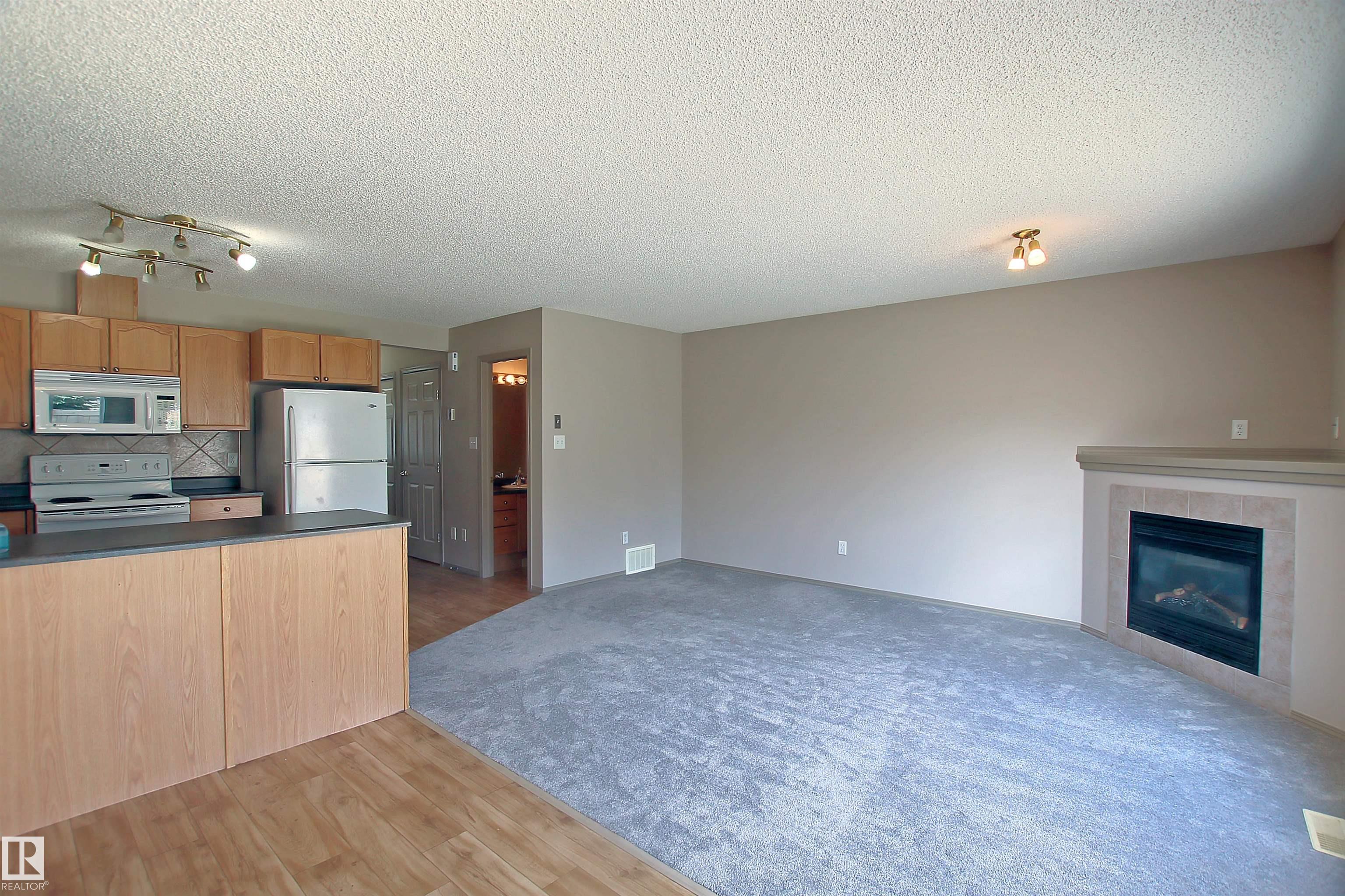 NO CONDO FEE. Don't miss out on this amazing property at a great location and with a big open front! Single family half-duplex home with an oversized double garage, big driveway with four car parking space, features 3 bedrooms and a cozy corner fireplace. Recent upgrades include new carpet, new window covering, new paint, maintenance free landing and deck. Unfinished basement waiting for your final touchs. Very close to bus route for Century Park and big park/playground and close to all amenties including schools, public transportation, parks, shopping, restaurants, and ANTHONY HENDAY.