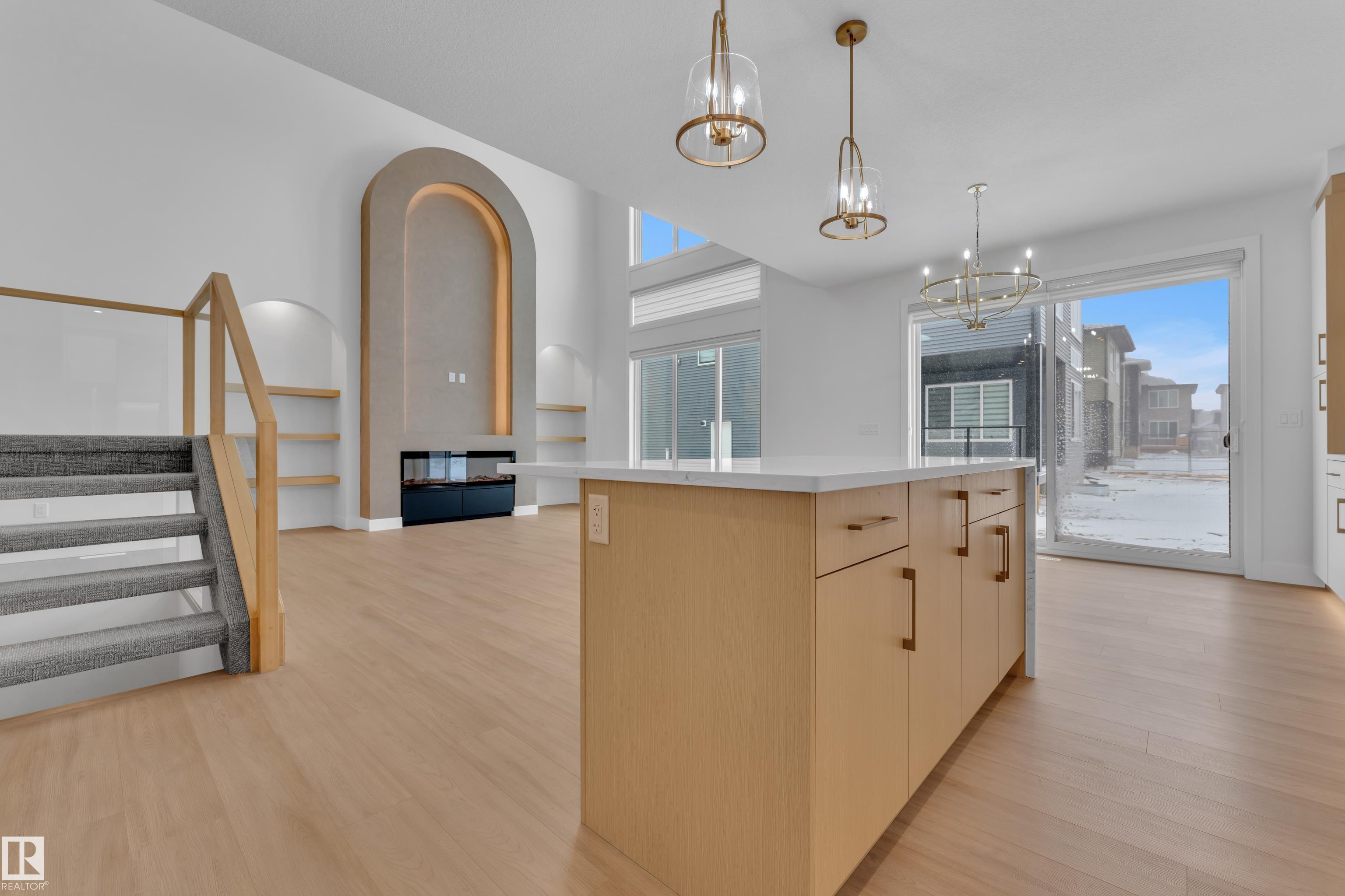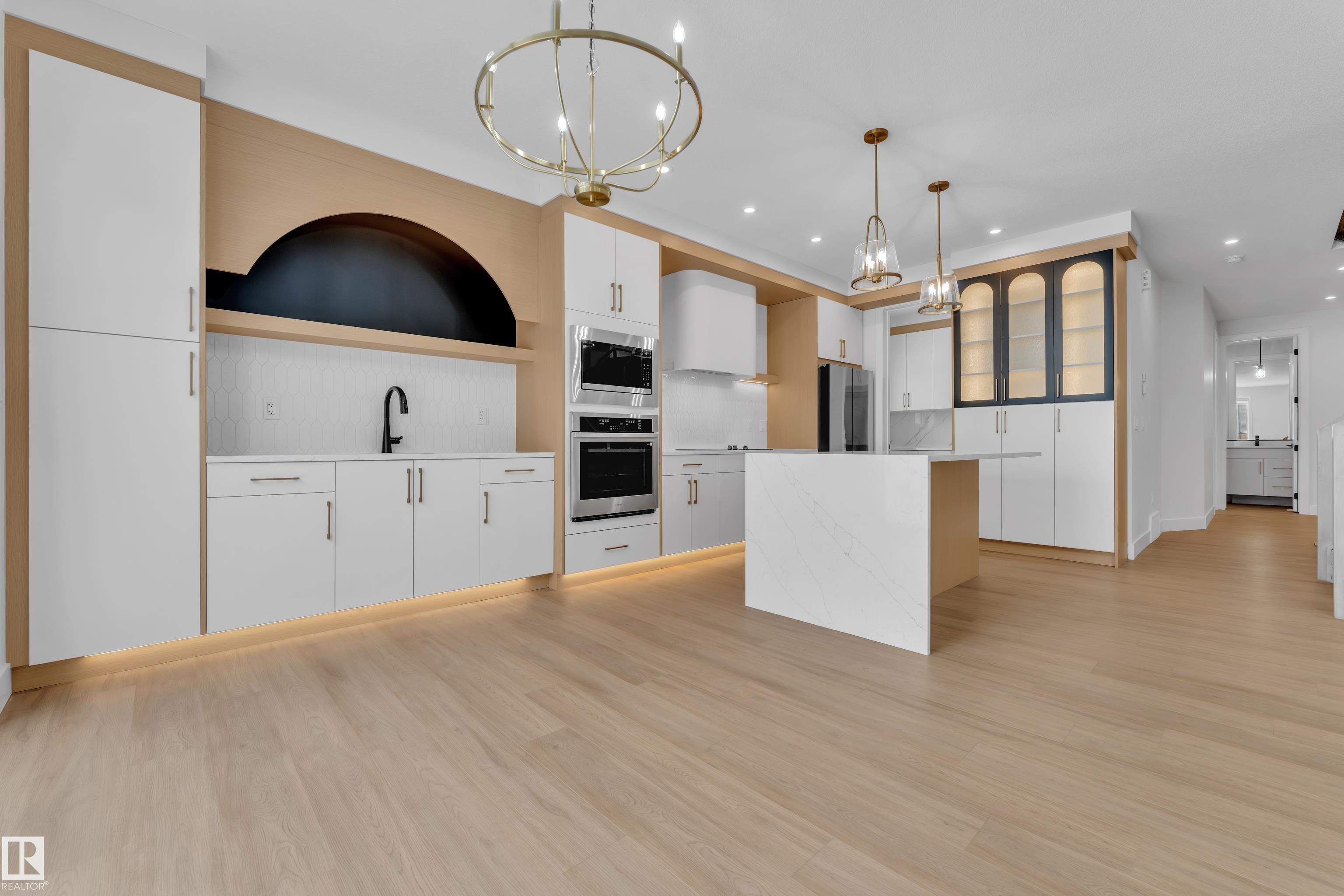 Welcome to this beautifully designed home with a unique layout in the heart of Orchards. A spacious foyer leads to a formal living area. The main floor features FULL BEDROOM, a 3PC bath, and a walk-in closet-perfect for guests or extended family. The MUDROOM includes built-in cabinetry, drawers, and a seating bench. A stunning staircase with glass railing adds a modern touch. The living area is highlighted by a lime-washed feature wall with arches and custom shelving. The dining area with patio doors leads to the backyard. The main kitchen showcases a stylish curved canopy, an EXTENDED kitchen, and a separate SPICE KITCHEN for added comfort and convenience. Upstairs offers a PRIMARY bedroom with a 5PC ensuite and walk-in closet, a second primary with a 3PC ensuite, and TWO more genereous sized bedrooms sharing a Jack & Jill bath. A bonus room and upstairs laundry complete this functional and stylish home. Ideally located close to schools, shopping centres & surrounded by scenic walking trails.