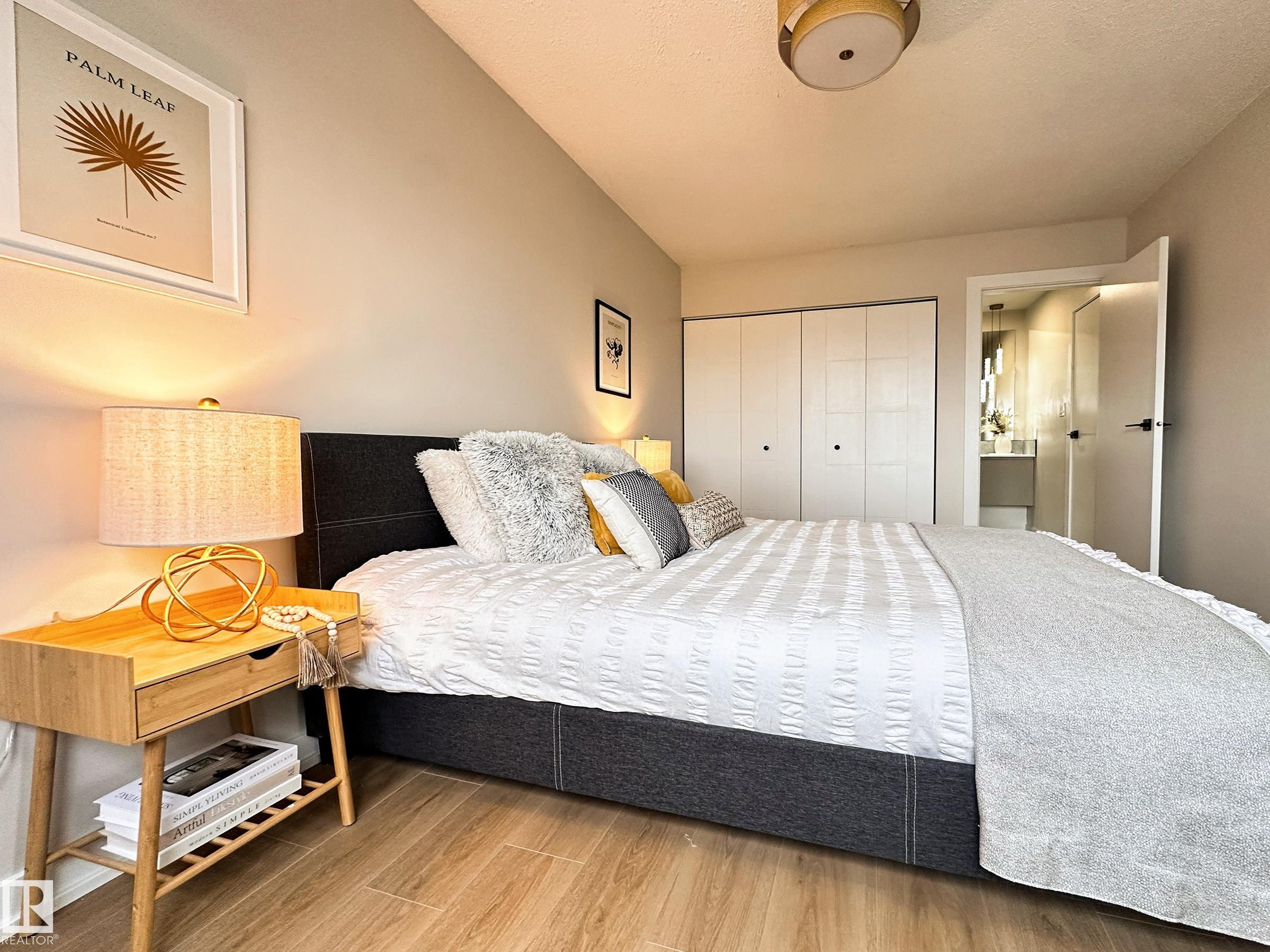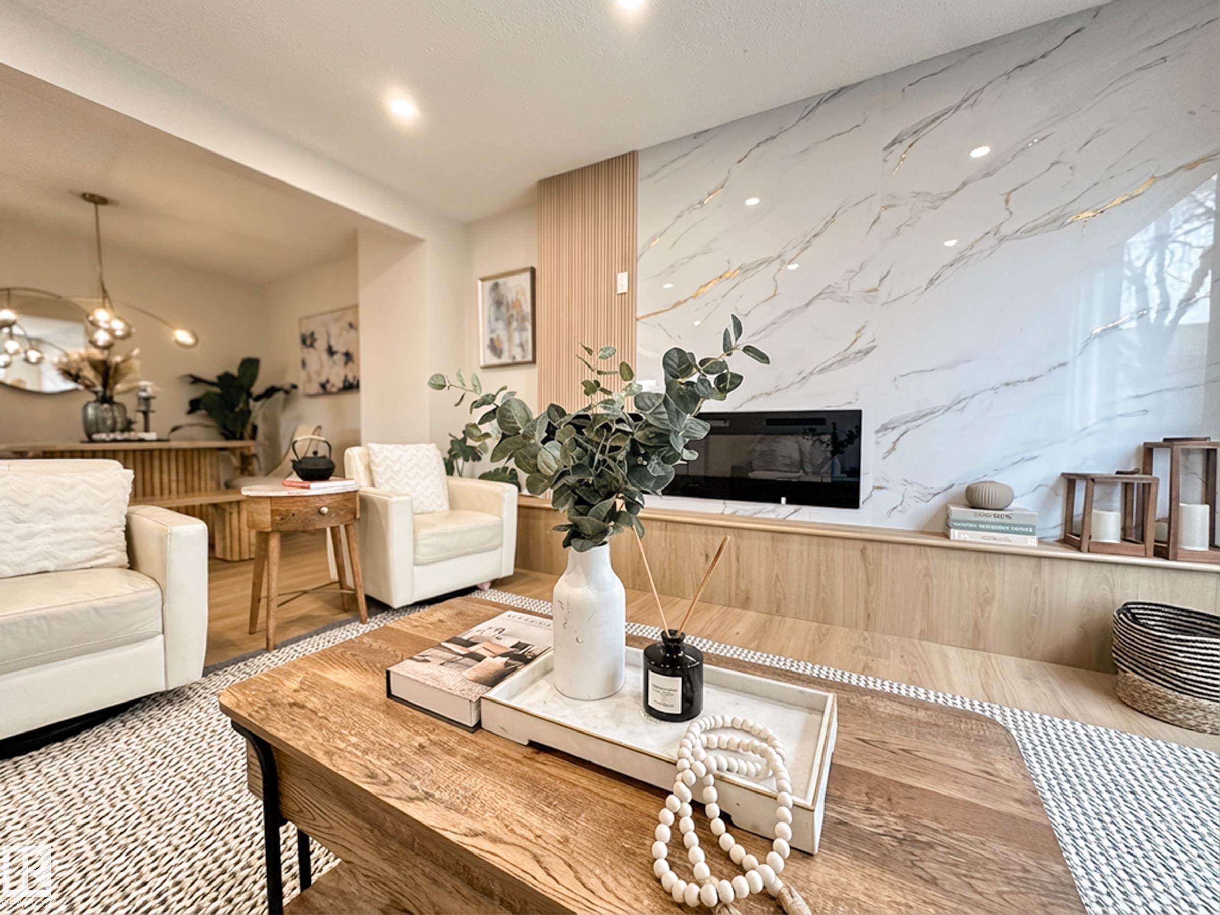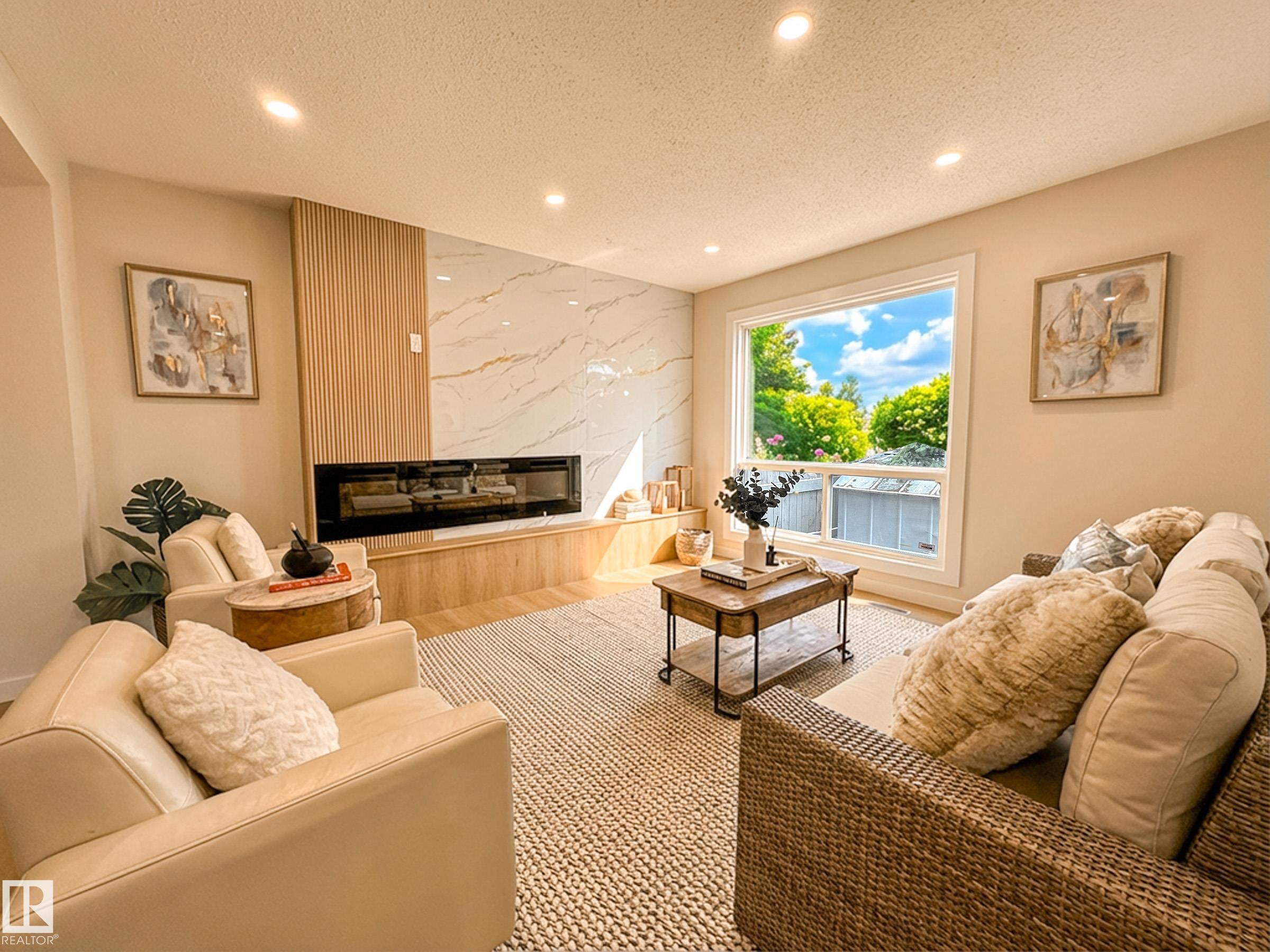 Welcome to this beautifully renovated End-Unit townhome, featuring 3+1 bedrooms, finished basement, and fenced private backyard, perfectly located within walking distance to West Edmonton Mall! Upon entering, you’ll be impressed by the spacious open-concept layout, includes the renovated kitchen boasting abundant cabinetry, lustrous quartz countertops, large eating island, and stainless steel appliances. The bright living room showcases a stunning fireplace, overlooks the south-facing backyard, flooding the home with abundant natural light. All luxury vinyl flooring leads you upstairs, where to find three generous bedrooms and a hotel style custom tiled new bathroom. Separate back door leads you to the fully finished basement offers a fourth bedroom with a large window and a full bathroom. Additional upgrades include newer HTW, fresh paint, all vinyl and tiling flooring (no carpet) and modern lighting fixtures throughout. Do not miss this great home!